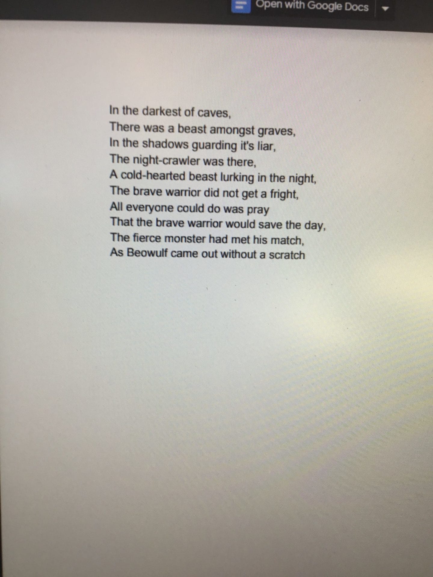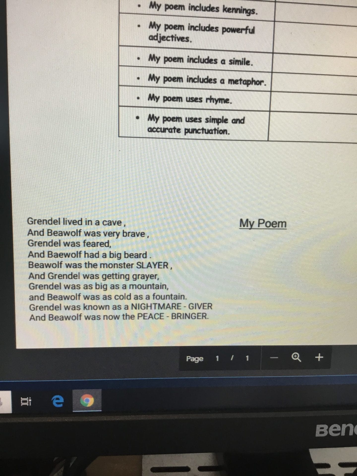 This week Year 5 have been writing poetry in the style of ‘Beowulf’ (an Anglo-Saxon epic poem). In maths, they have been converting improper fractions into mixed number fractions. Take a look at some of the amazing work that has been handed in this week.