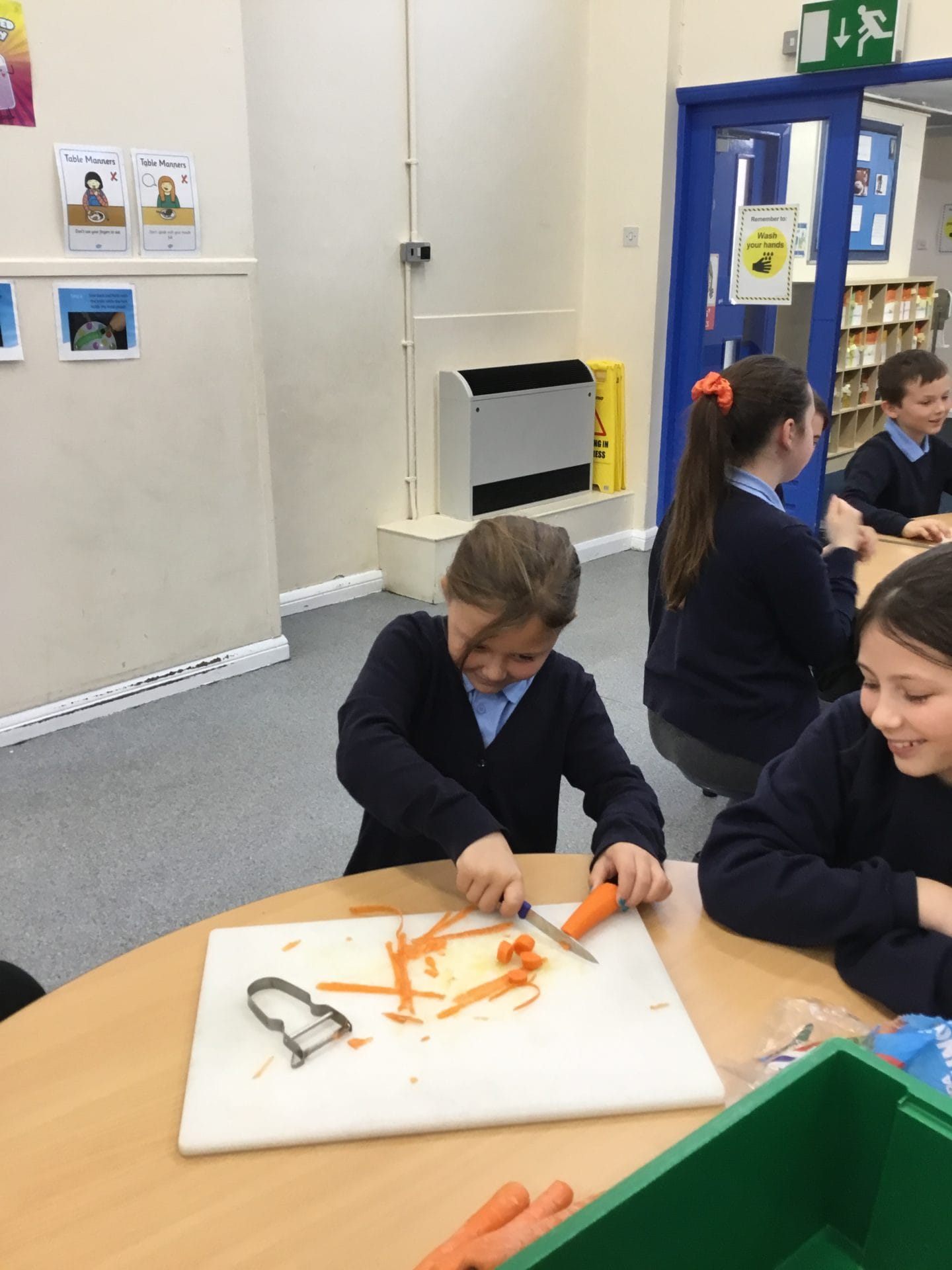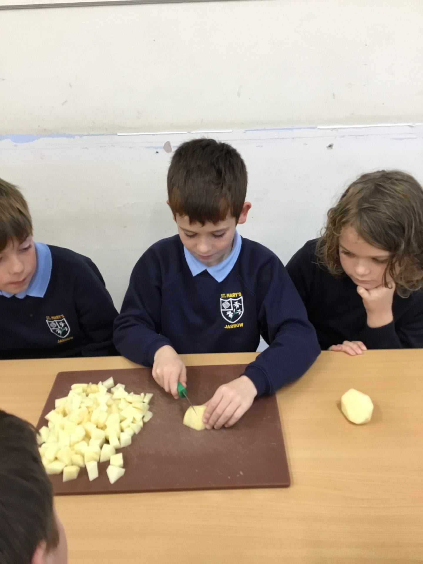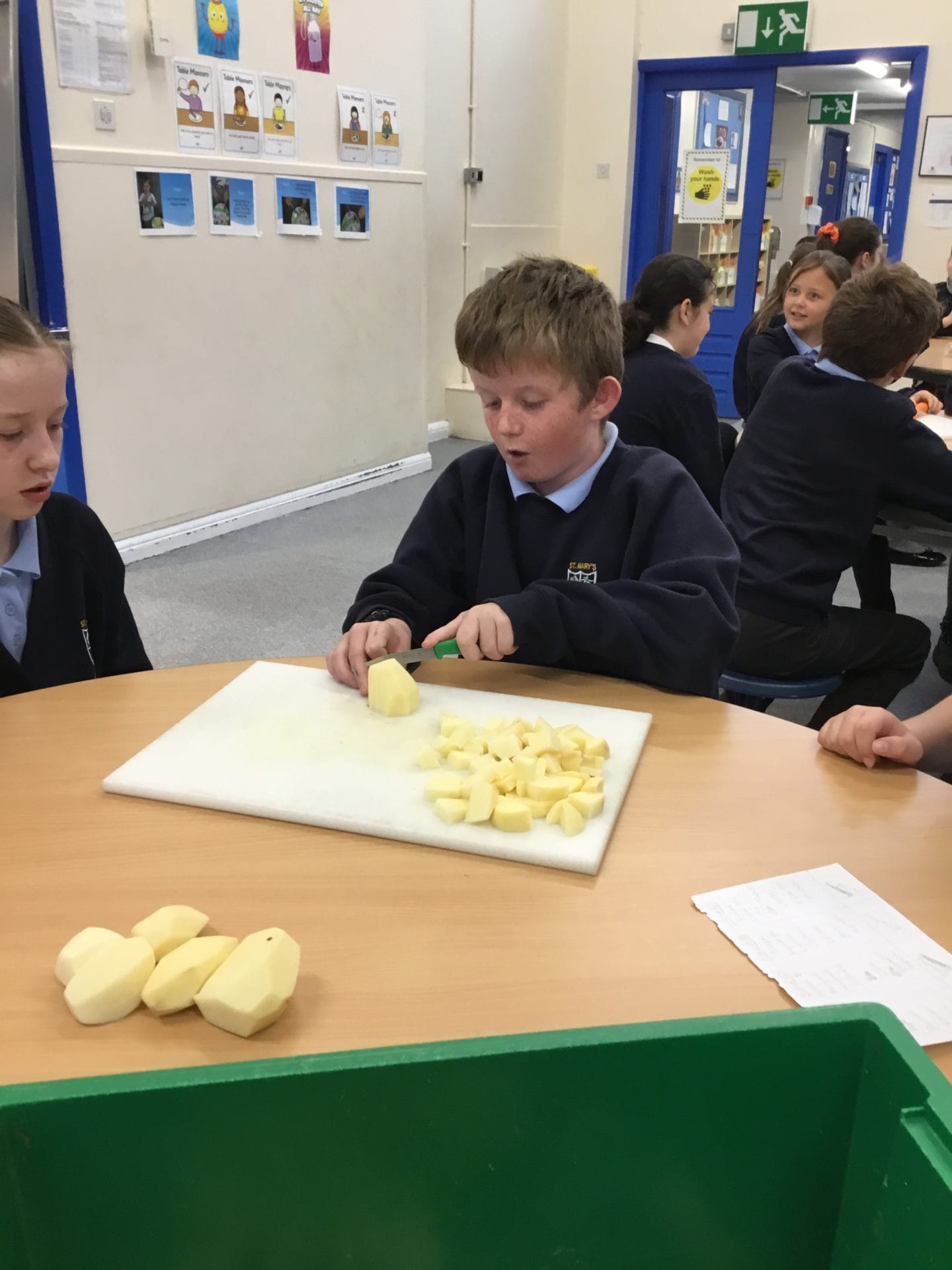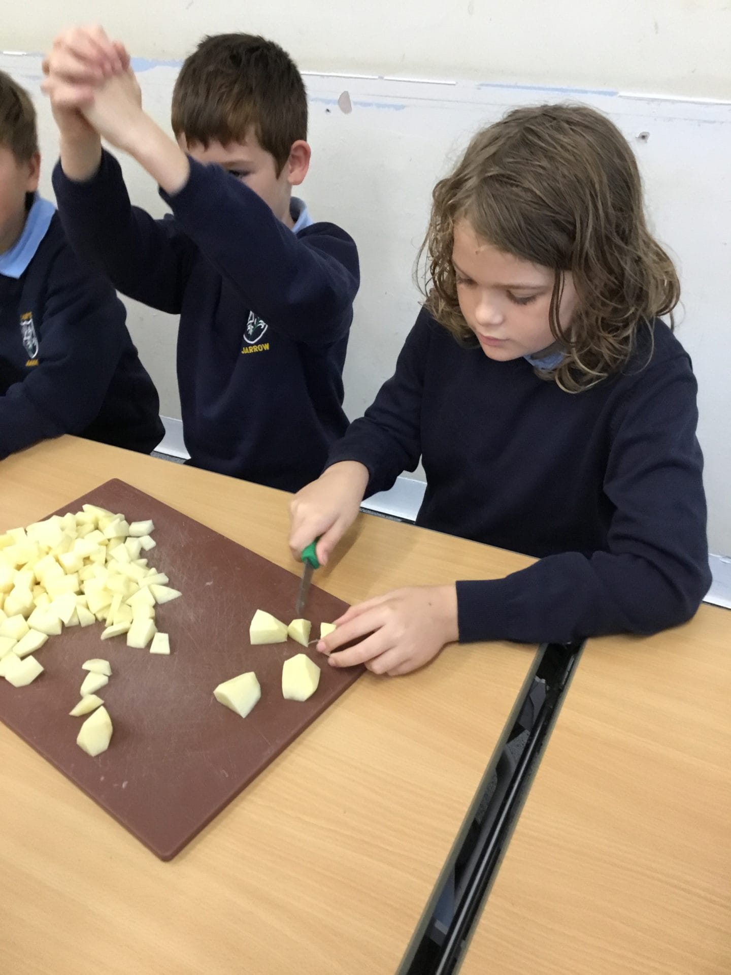 The children worked in groups and mastered their peeling and chopping techniques. They practised using the potato peeler and how to use it safely and efficiently. They knew that they had to peel away from their hands. They used knives to dice potatoes, onions and carrots using the claw grip, tunnel grip and lever technique. They cut the vegetables in half so that they were flat. They found that this was the safest way to do it and allowed them to maintain a steady surface for chopping. The children now know the difference between cutting and chopping. We also discussed the use of a chopping board and how it is important to use a different board when chopping different ingredients. For example, meat and vegetables.