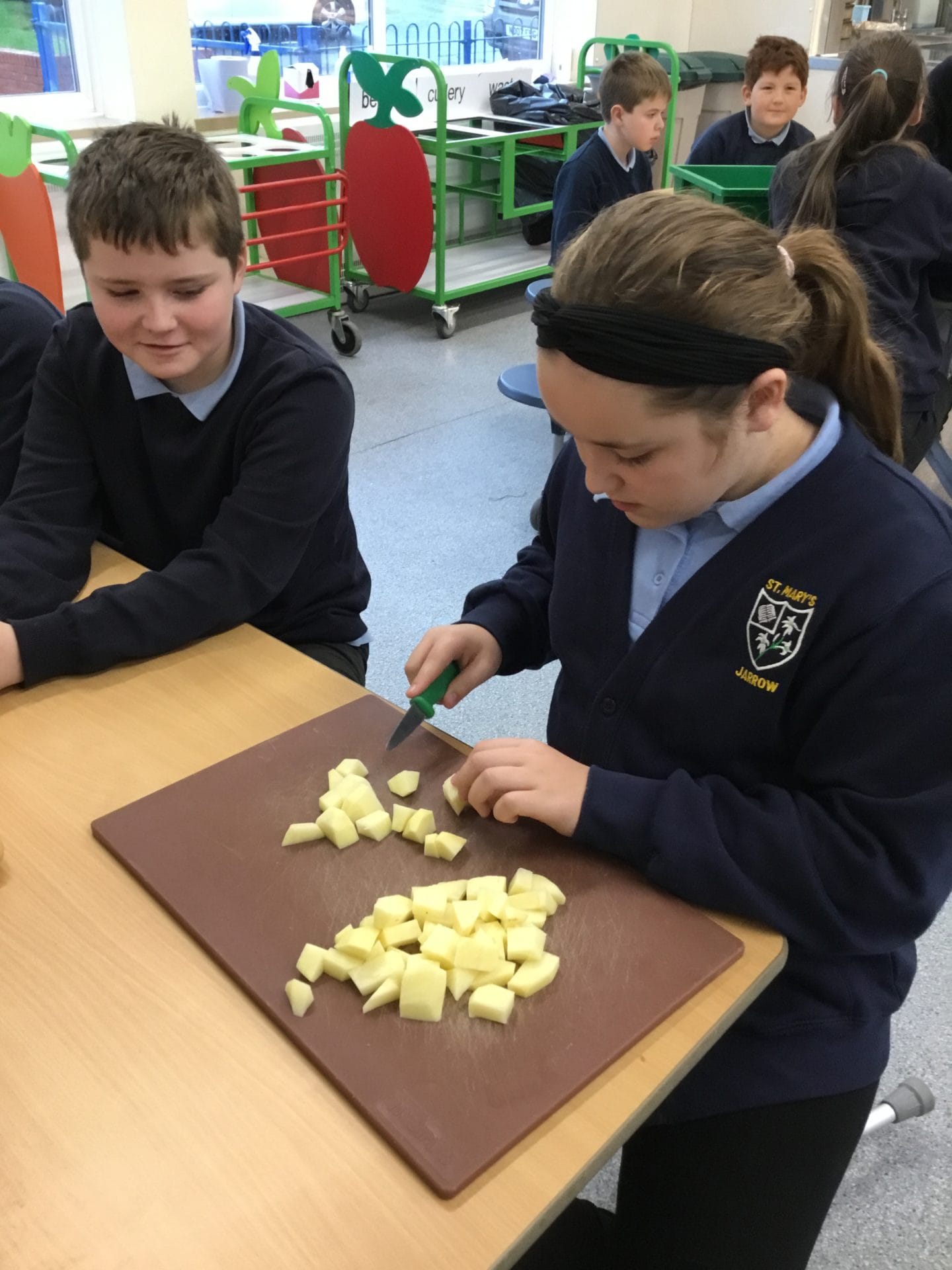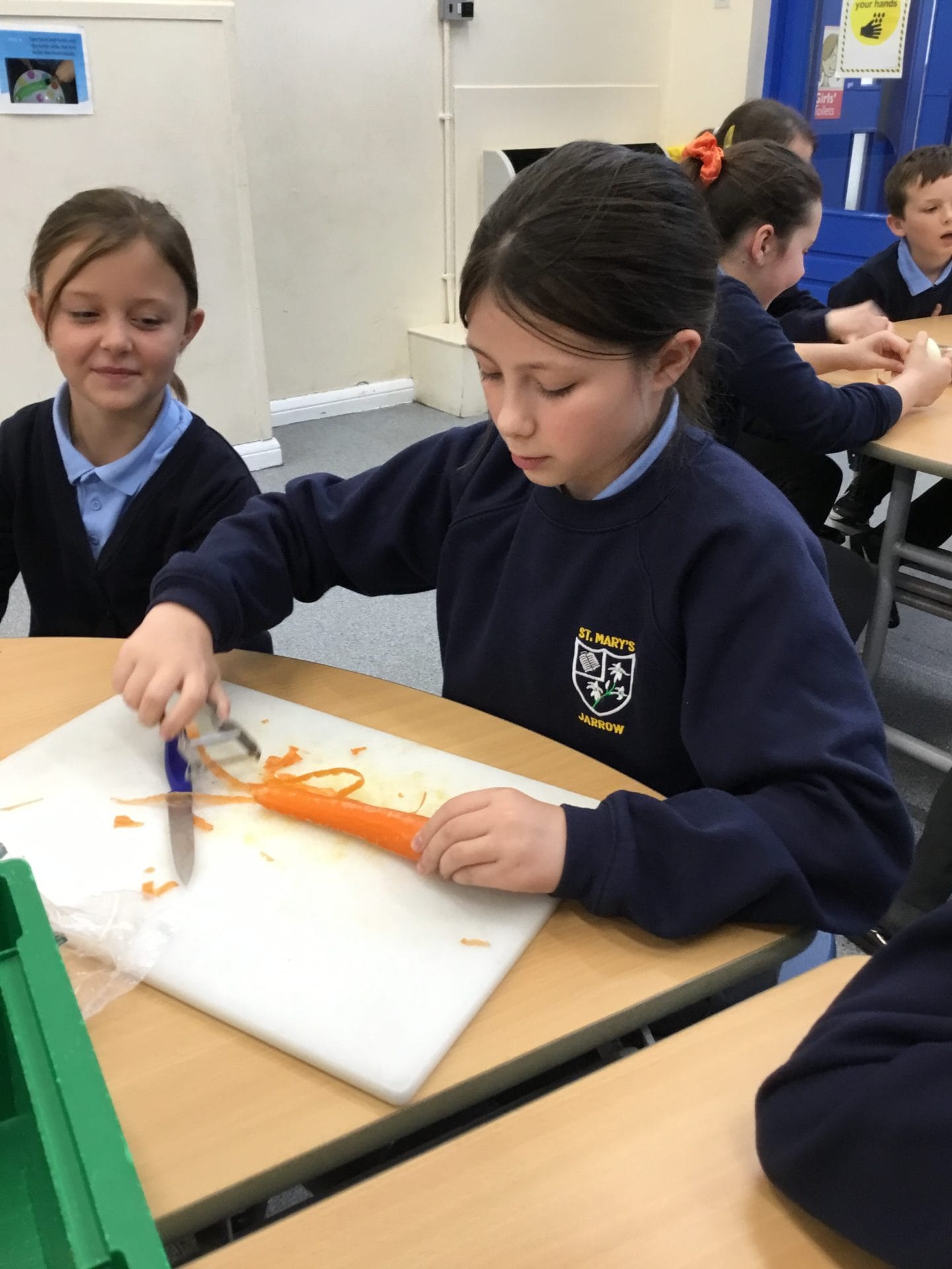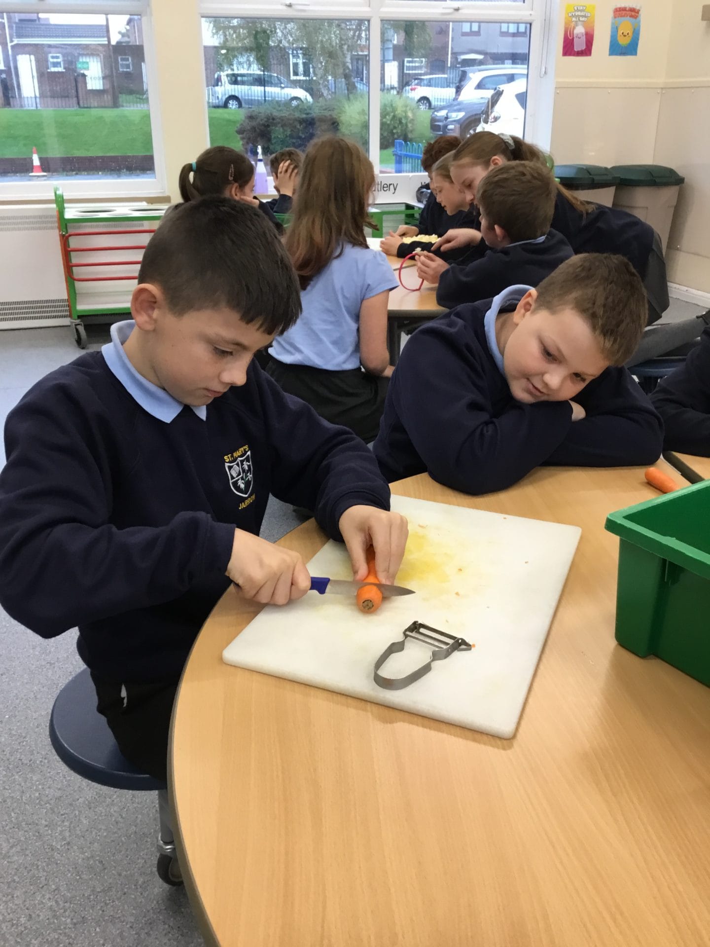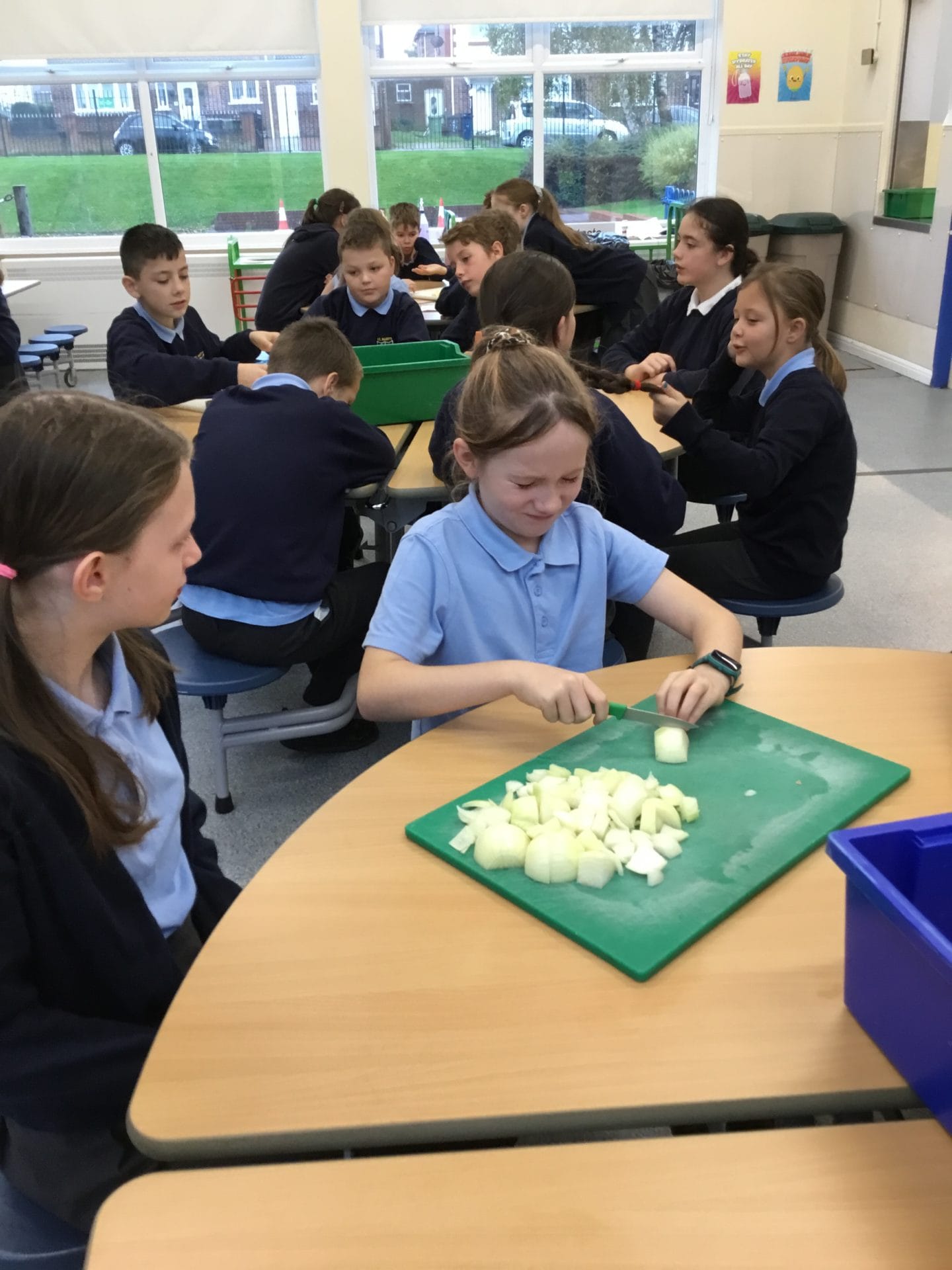 The children worked in groups and mastered their peeling and chopping techniques. They practised using the potato peeler and how to use it safely and efficiently. They knew that they had to peel away from their hands. They used knives to dice potatoes, onions and carrots using the claw grip, tunnel grip and lever technique. They cut the vegetables in half so that they were flat. They found that this was the safest way to do it and allowed them to maintain a steady surface for chopping. The children now know the difference between cutting and chopping. We also discussed the use of a chopping board and how it is important to use a different board when chopping different ingredients. For example, meat and vegetables.