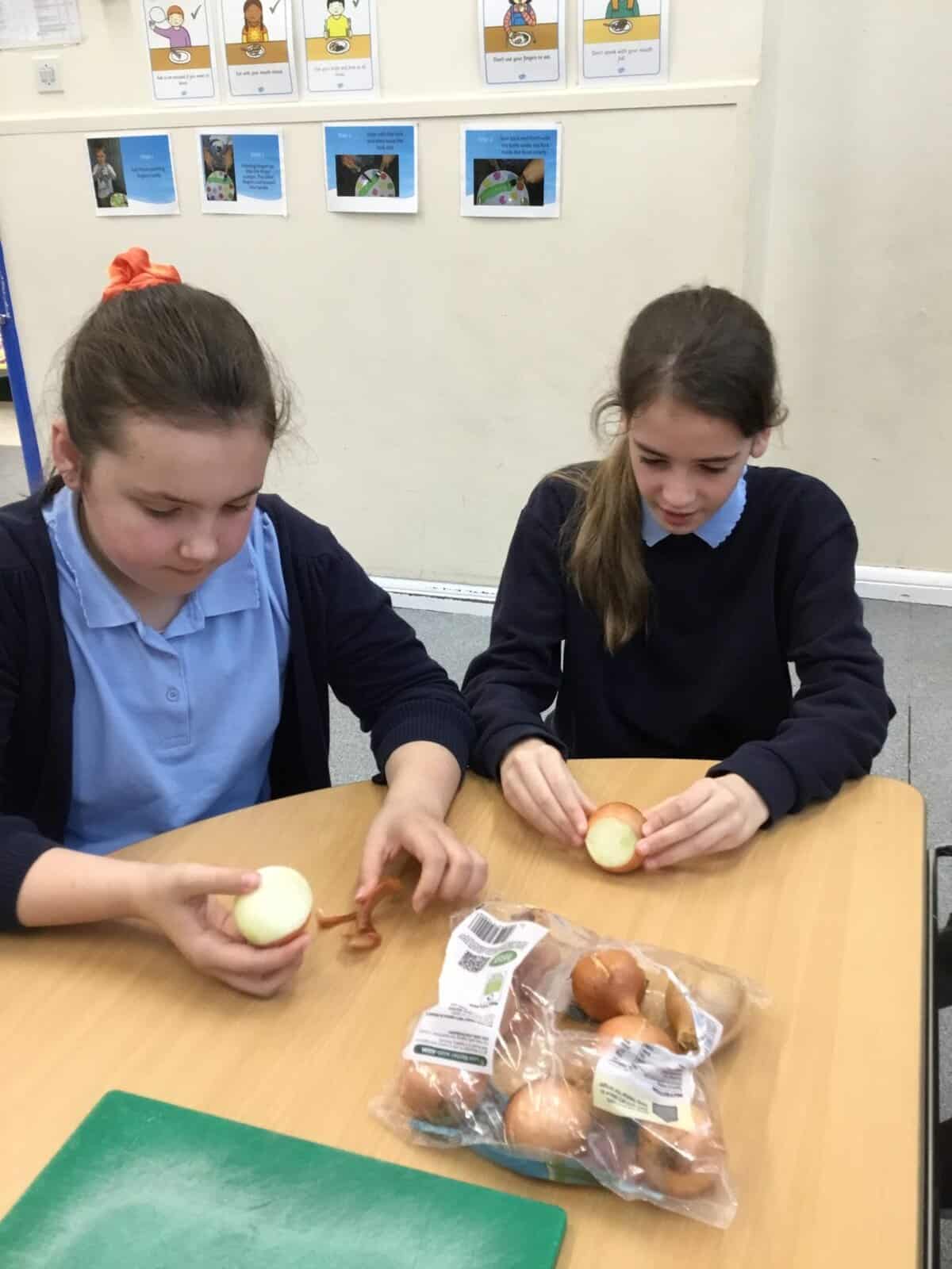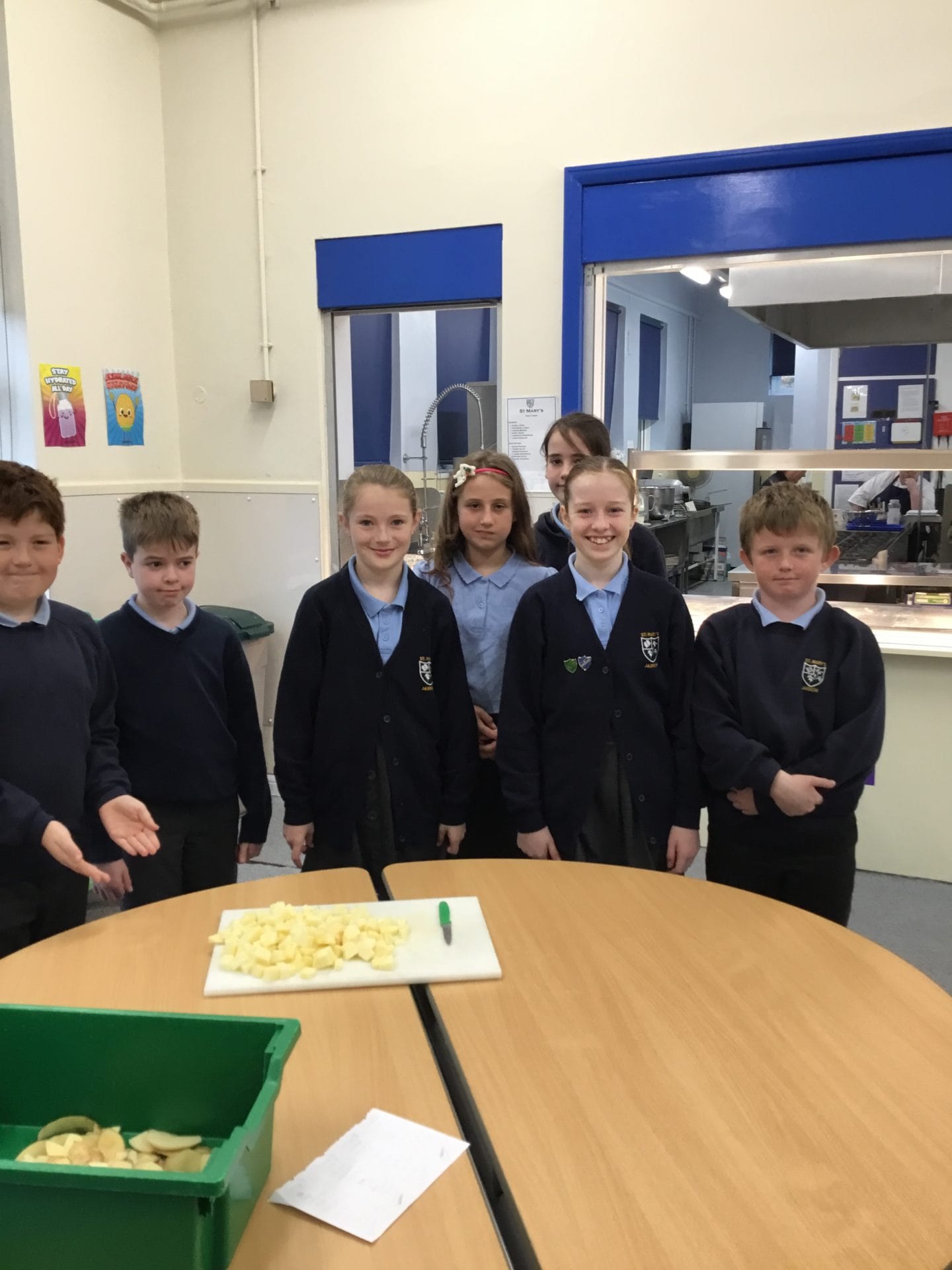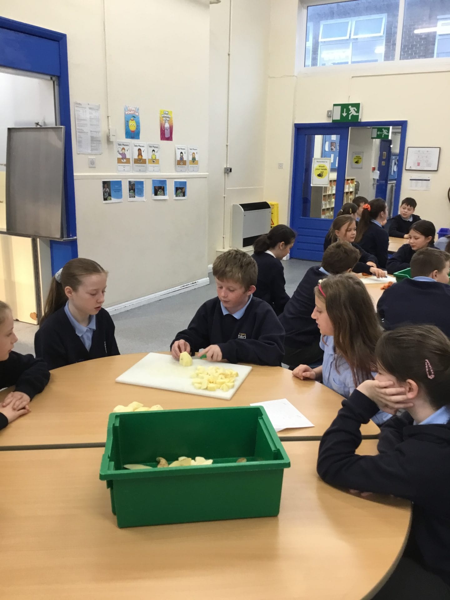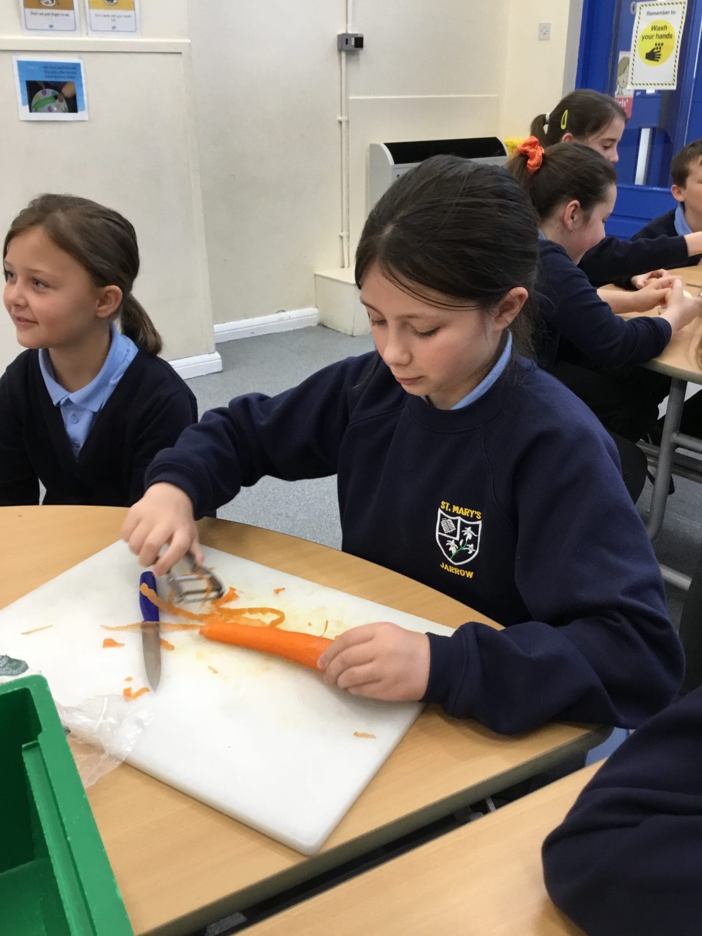 The children worked in groups and mastered their peeling and chopping techniques. They practised using the potato peeler and how to use it safely and efficiently. They knew that they had to peel away from their hands. They used knives to dice potatoes, onions and carrots using the claw grip, tunnel grip and lever technique. They cut the vegetables in half so that they were flat. They found that this was the safest way to do it and allowed them to maintain a steady surface for chopping. The children now know the difference between cutting and chopping. We also discussed the use of a chopping board and how it is important to use a different board when chopping different ingredients. For example, meat and vegetables.