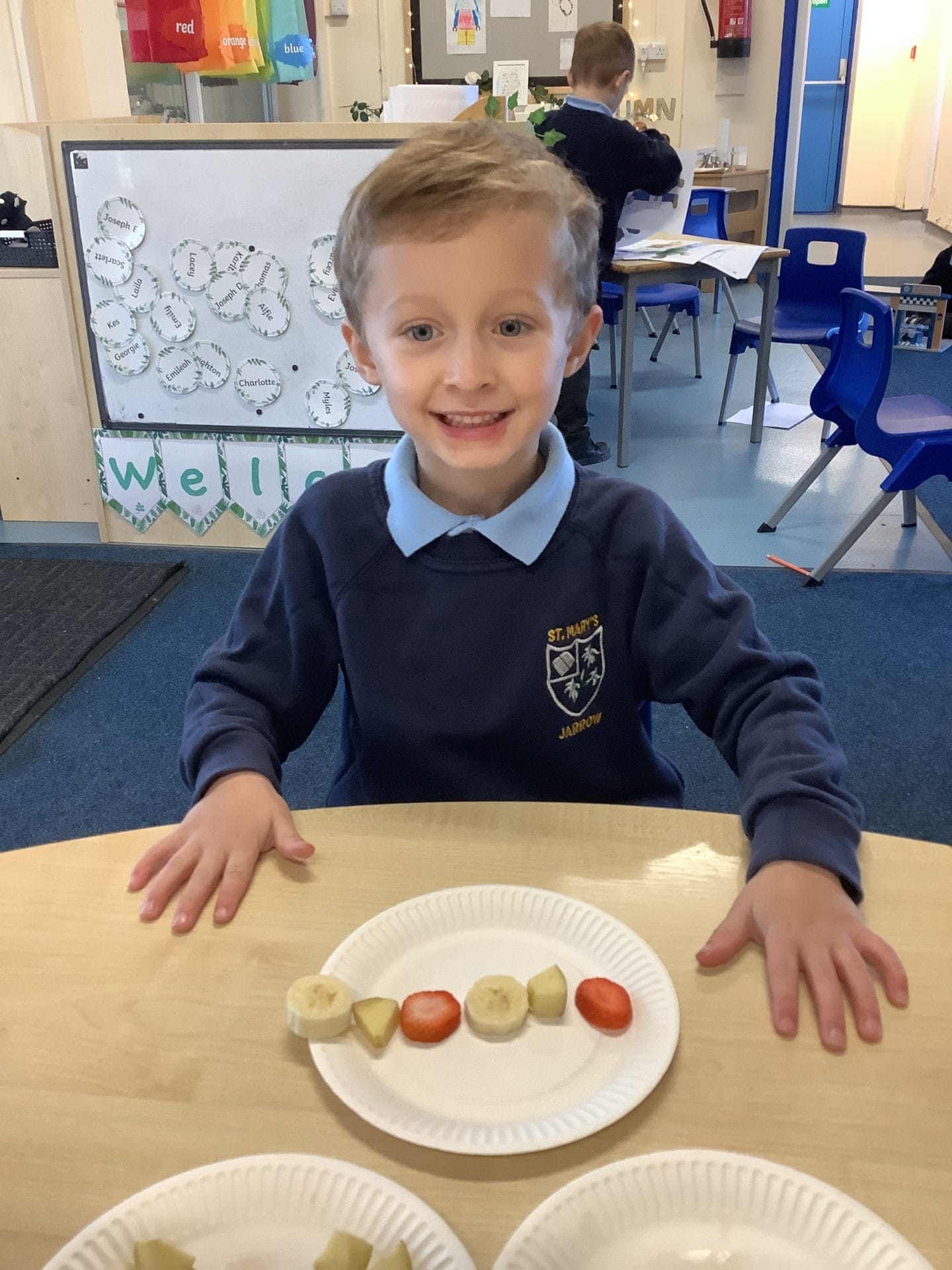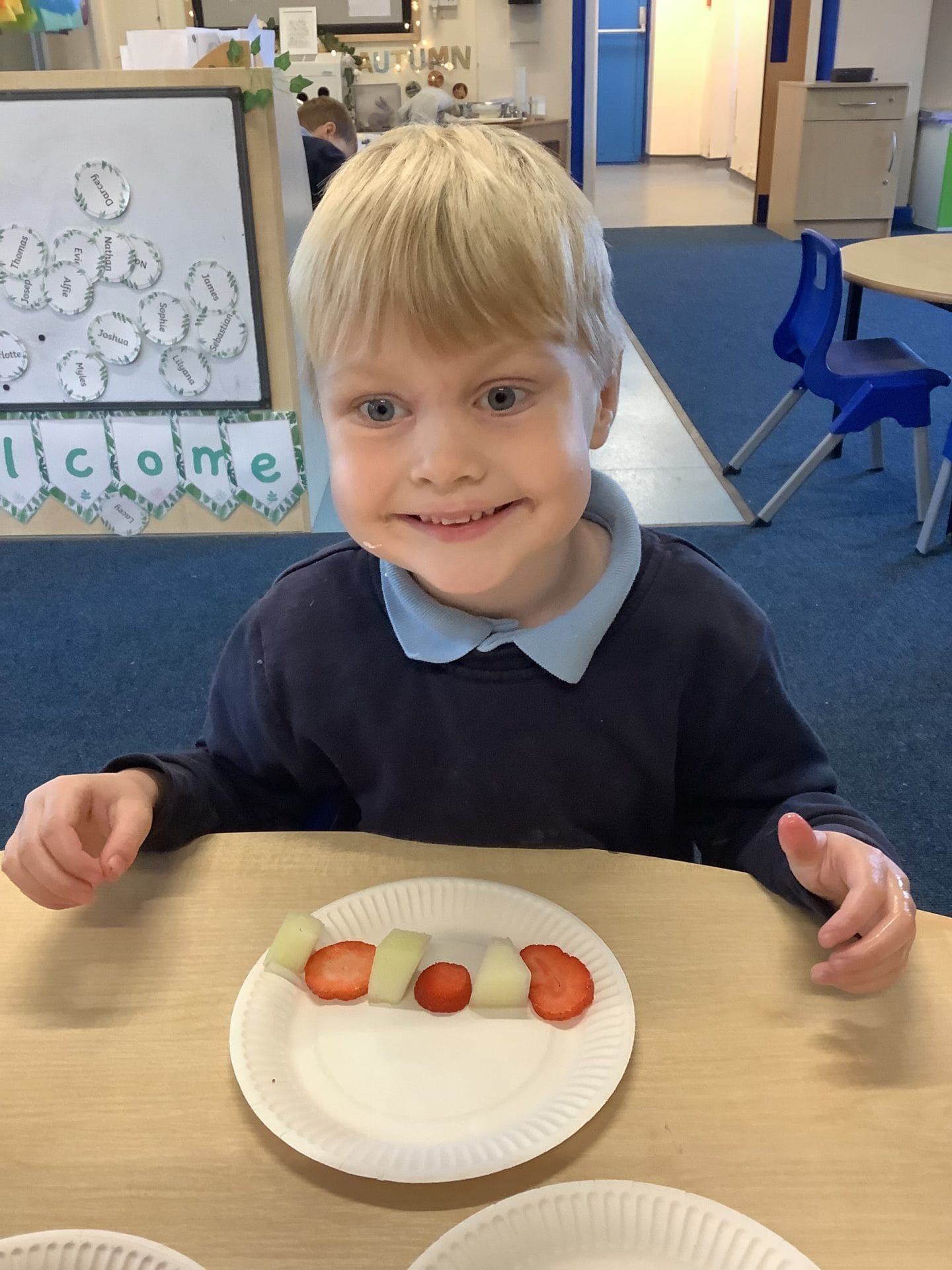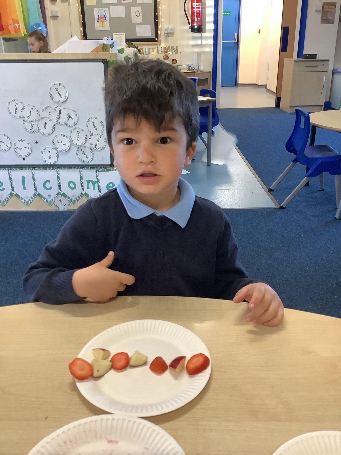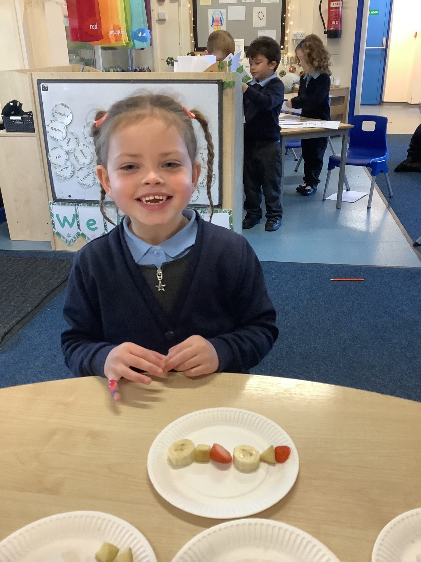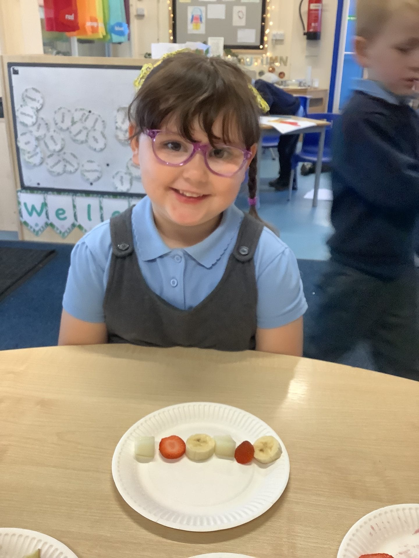 Reception made some healthy fruit kebabs as part of our upcoming food technology day. Since the children have been showing off their skills in pattern making, we challenged them to create their own repeating pattern using fruit.