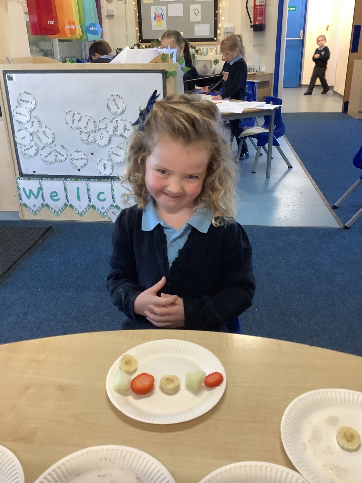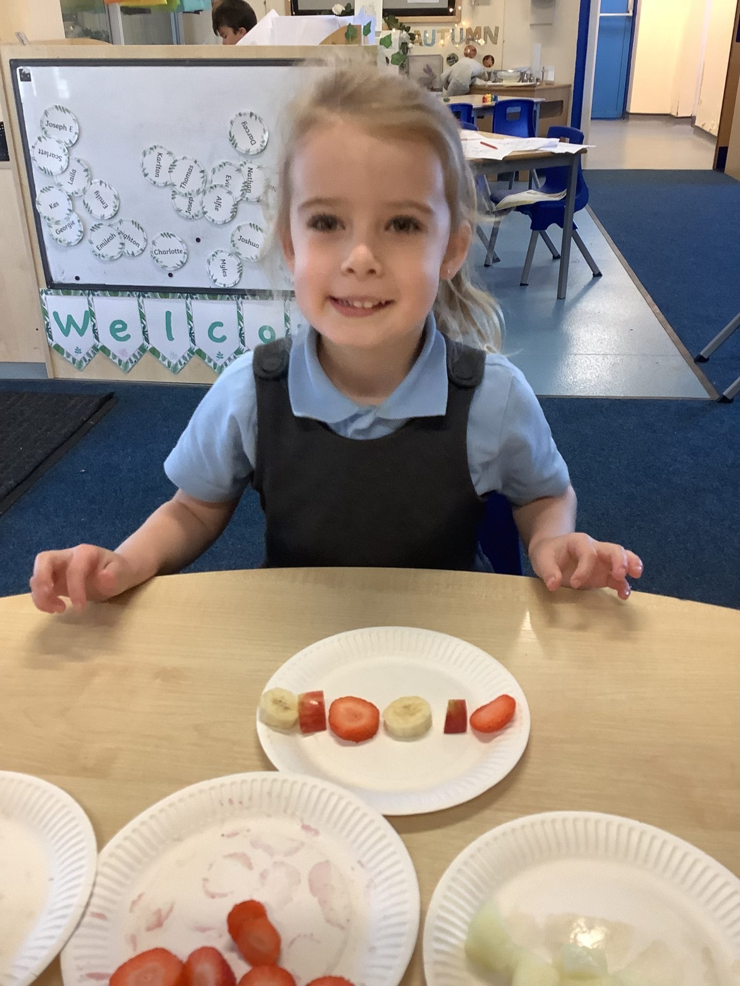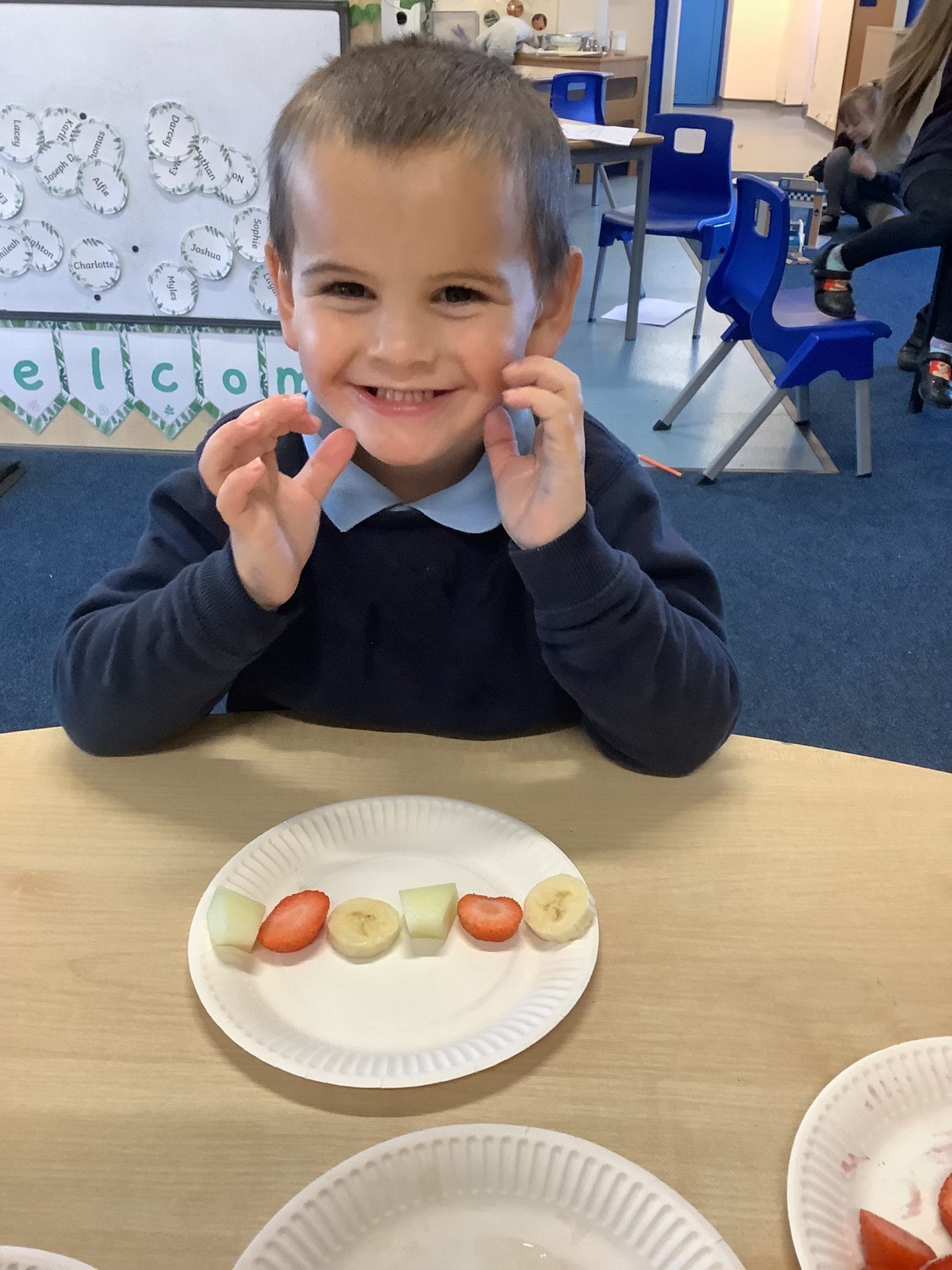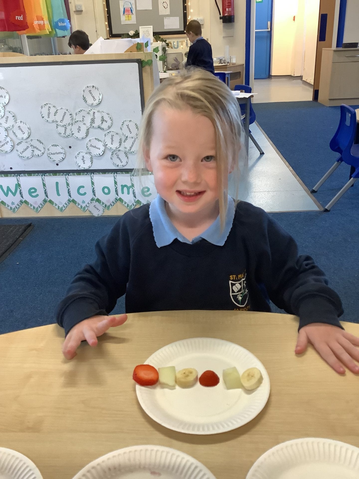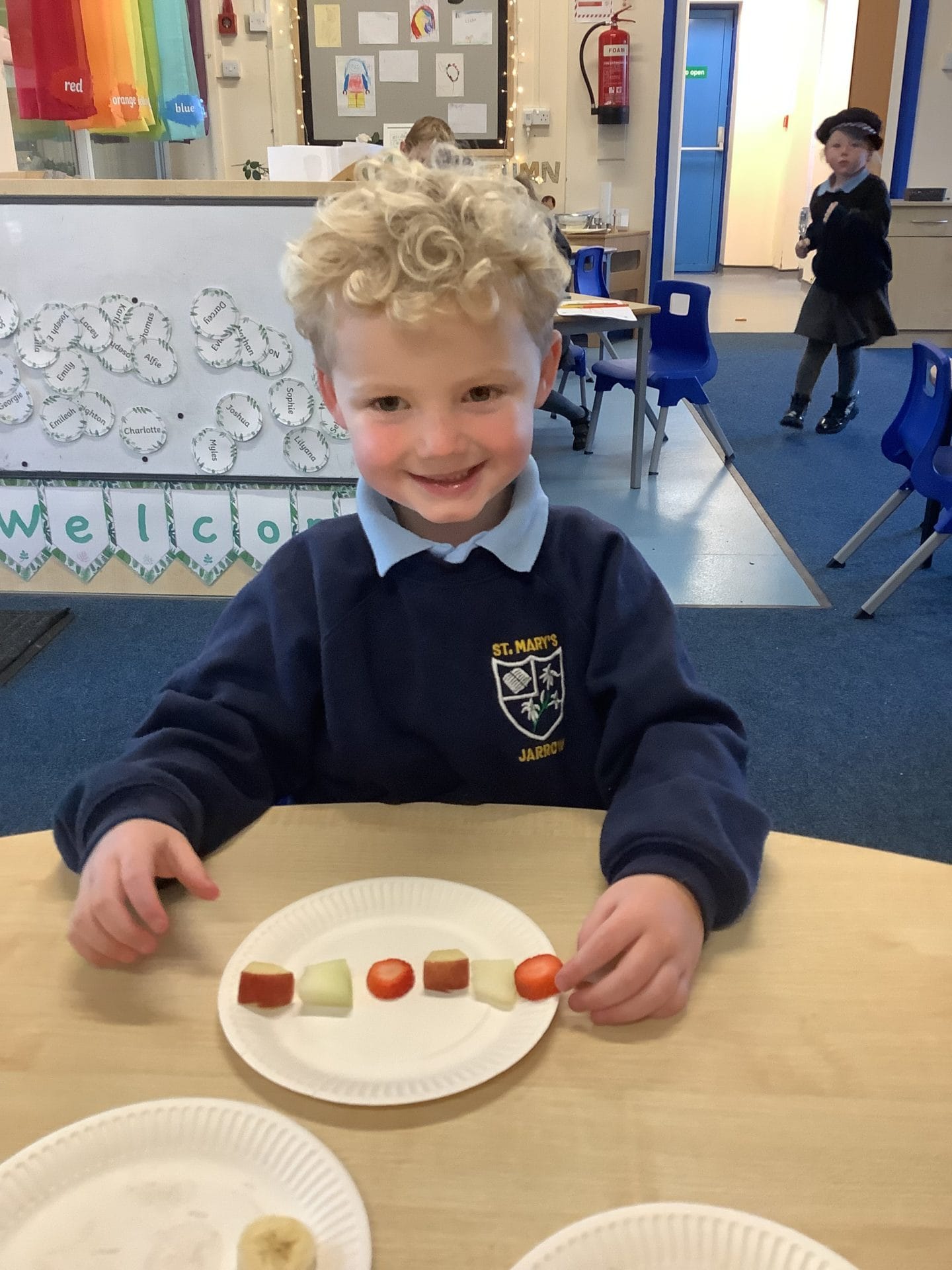 Reception made some healthy fruit kebabs as part of our upcoming food technology day. Since the children have been showing off their skills in pattern making, we challenged them to create their own repeating pattern using fruit.