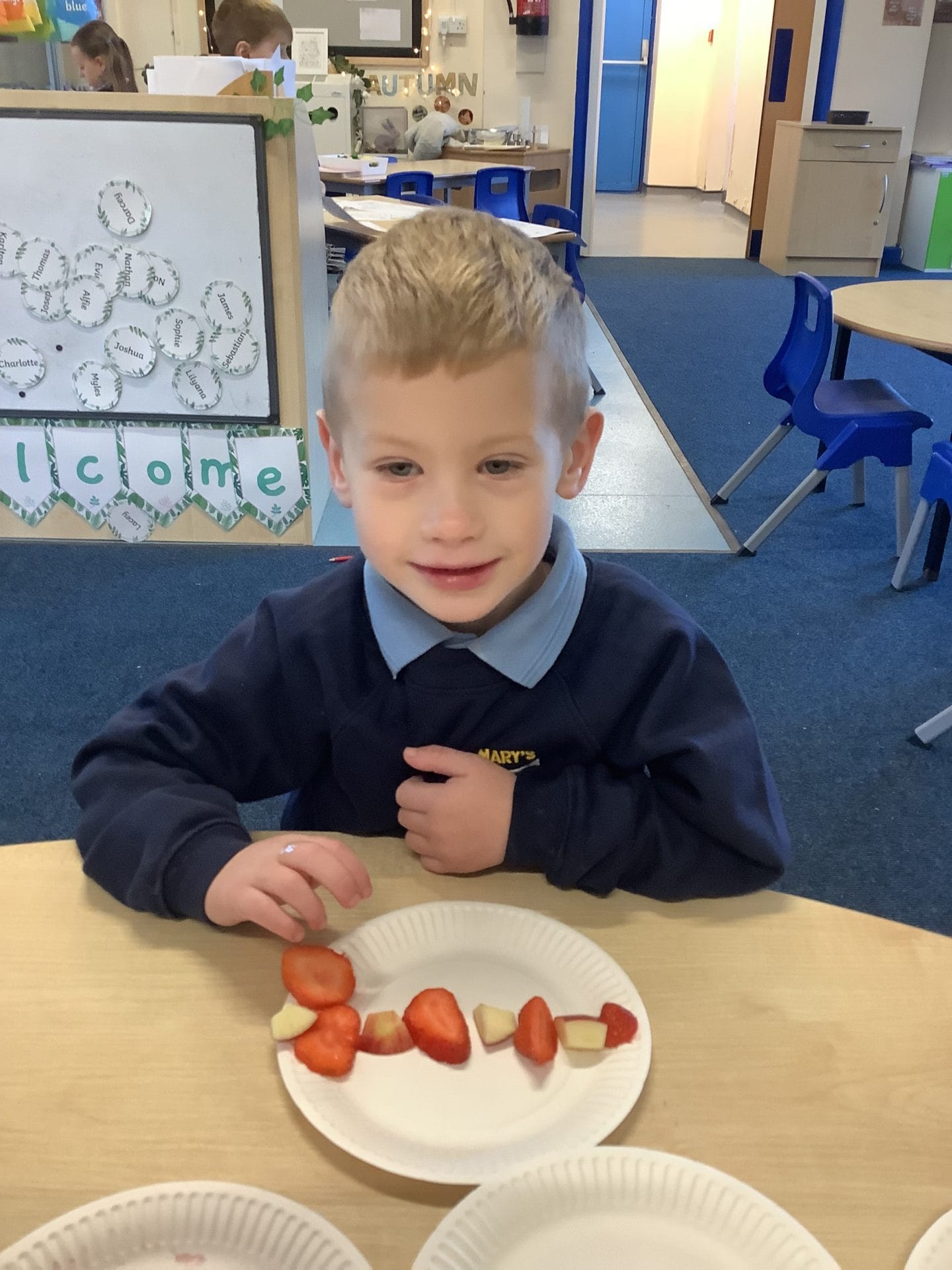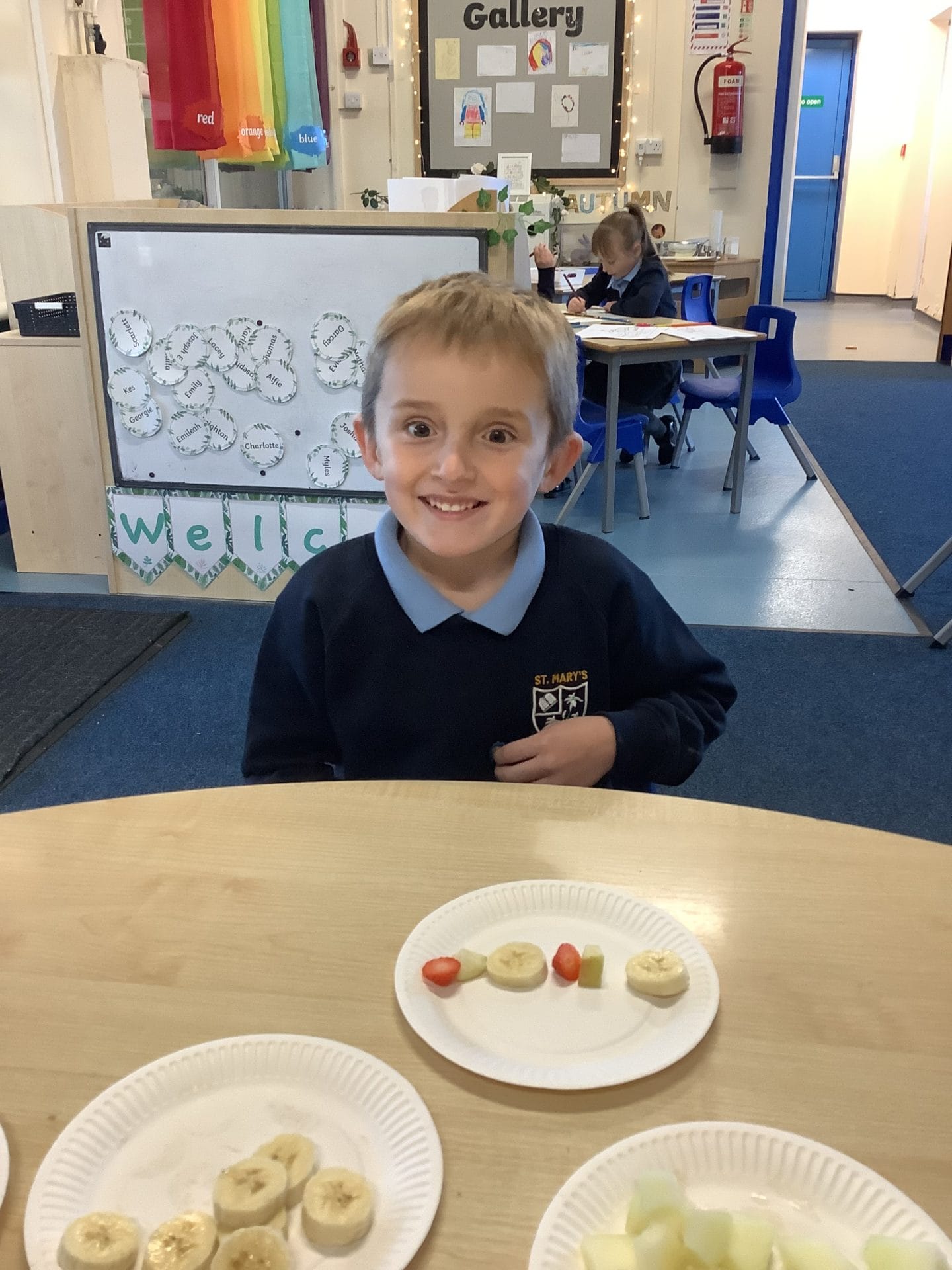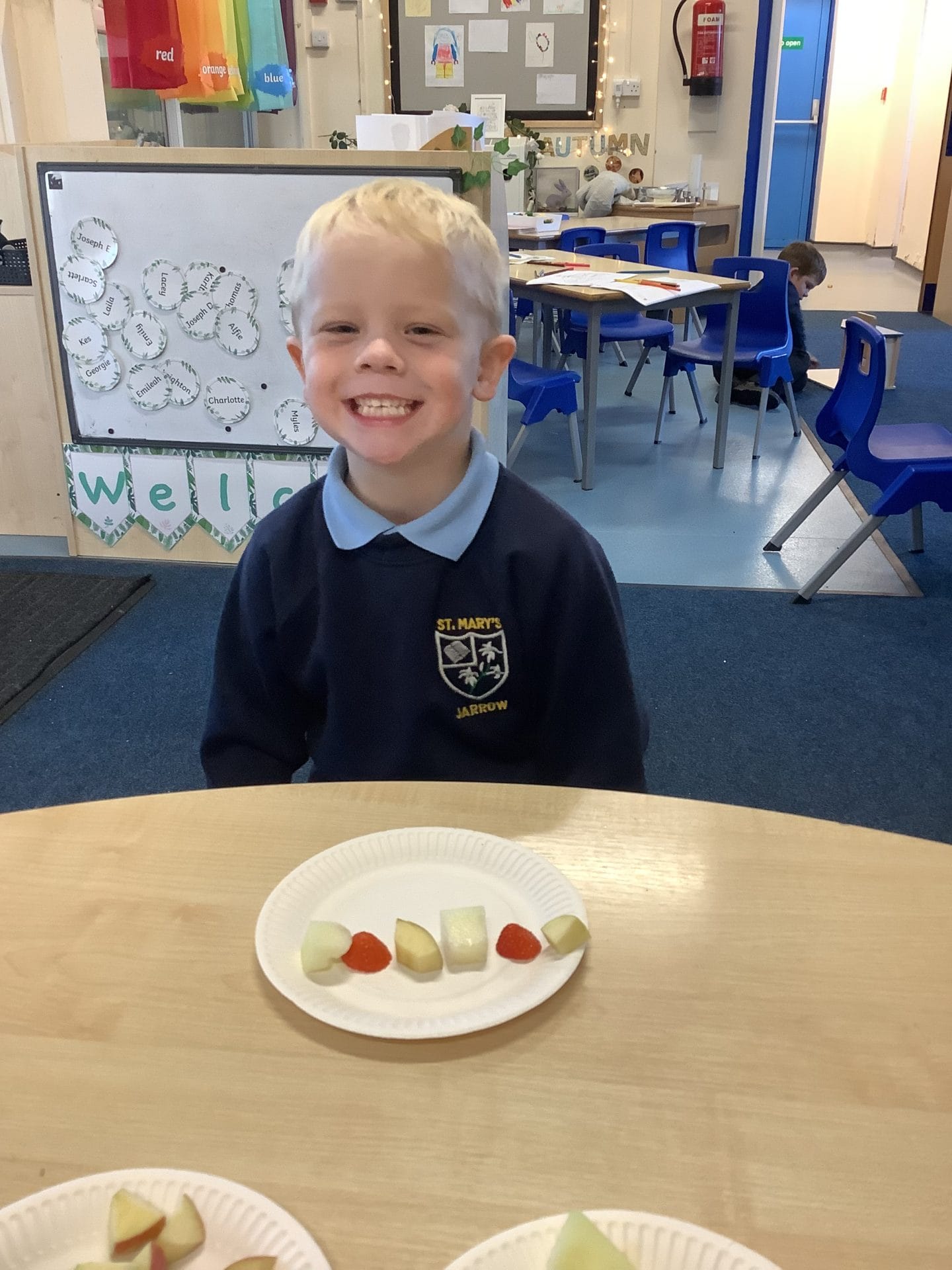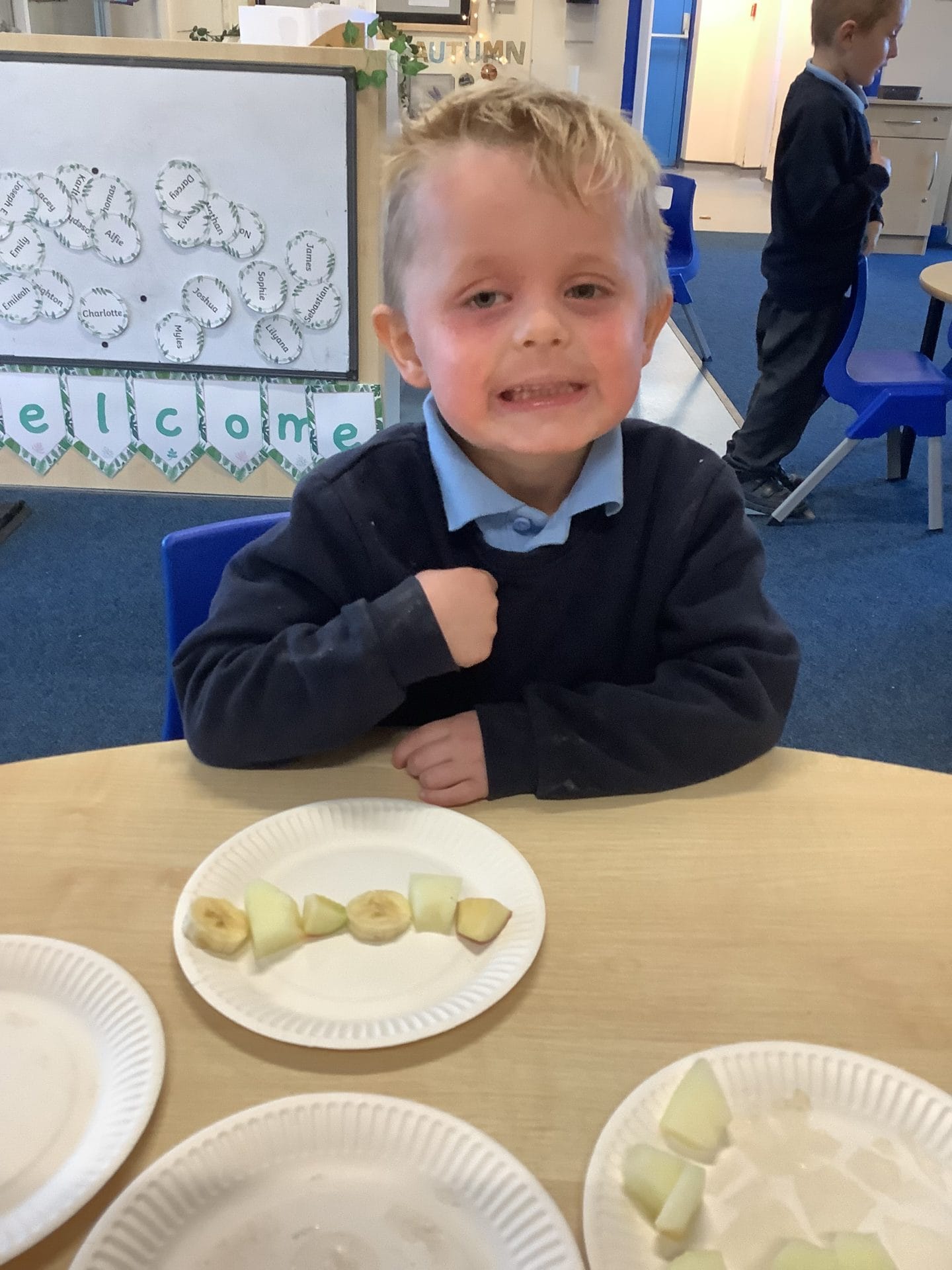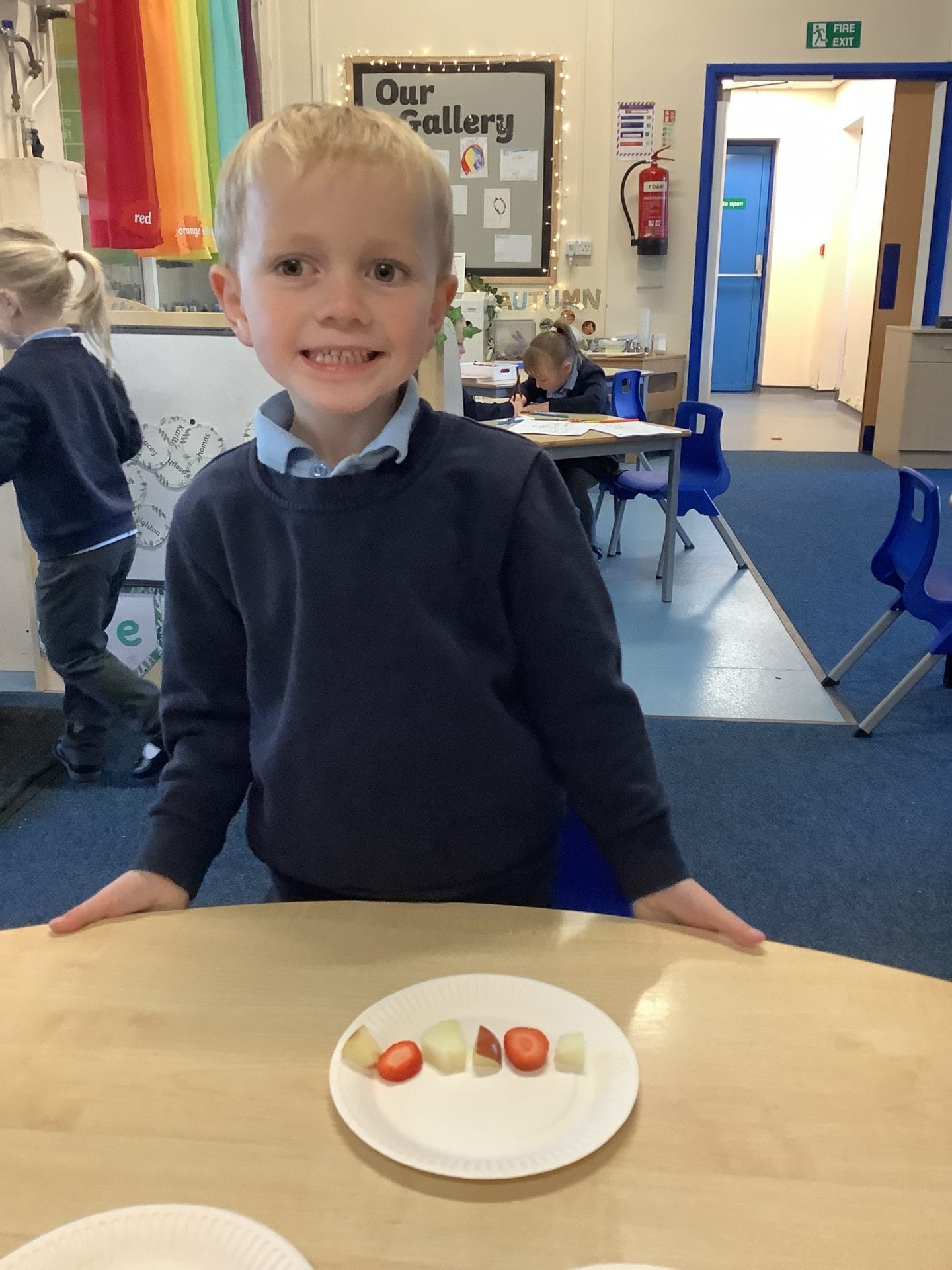 Reception made some healthy fruit kebabs as part of our upcoming food technology day. Since the children have been showing off their skills in pattern making, we challenged them to create their own repeating pattern using fruit.