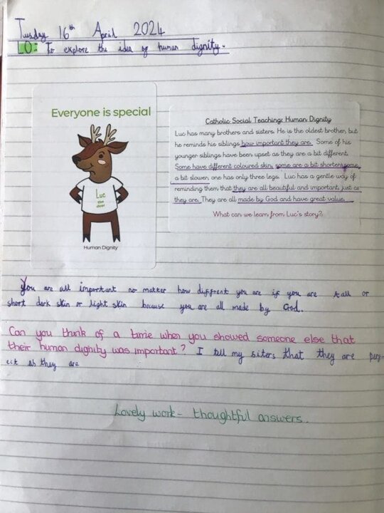 As part of Catholic Social Teaching, Y3 have been exploring what is meant by human dignity. The children made valuable contributions to discussion and recorded their ideas thoughtfully.