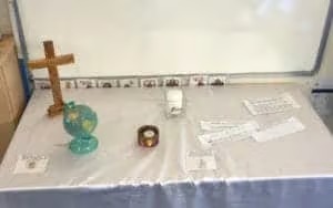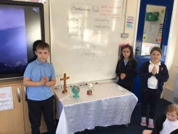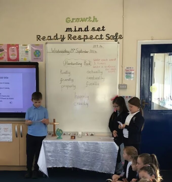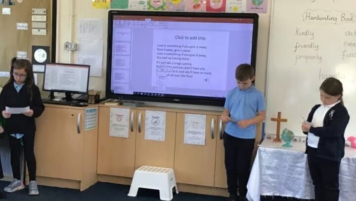 Today’s class Liturgy was prepared and presented by Alice, Noah and Ellis. They chose the theme of ‘love’ and explained how God loves us all and that we should spread love around the world. We sang ‘Love is something if you give it away’ and shared ideas of how we can spread love. ‘It can be as simple as giving a smile’ (Quote).