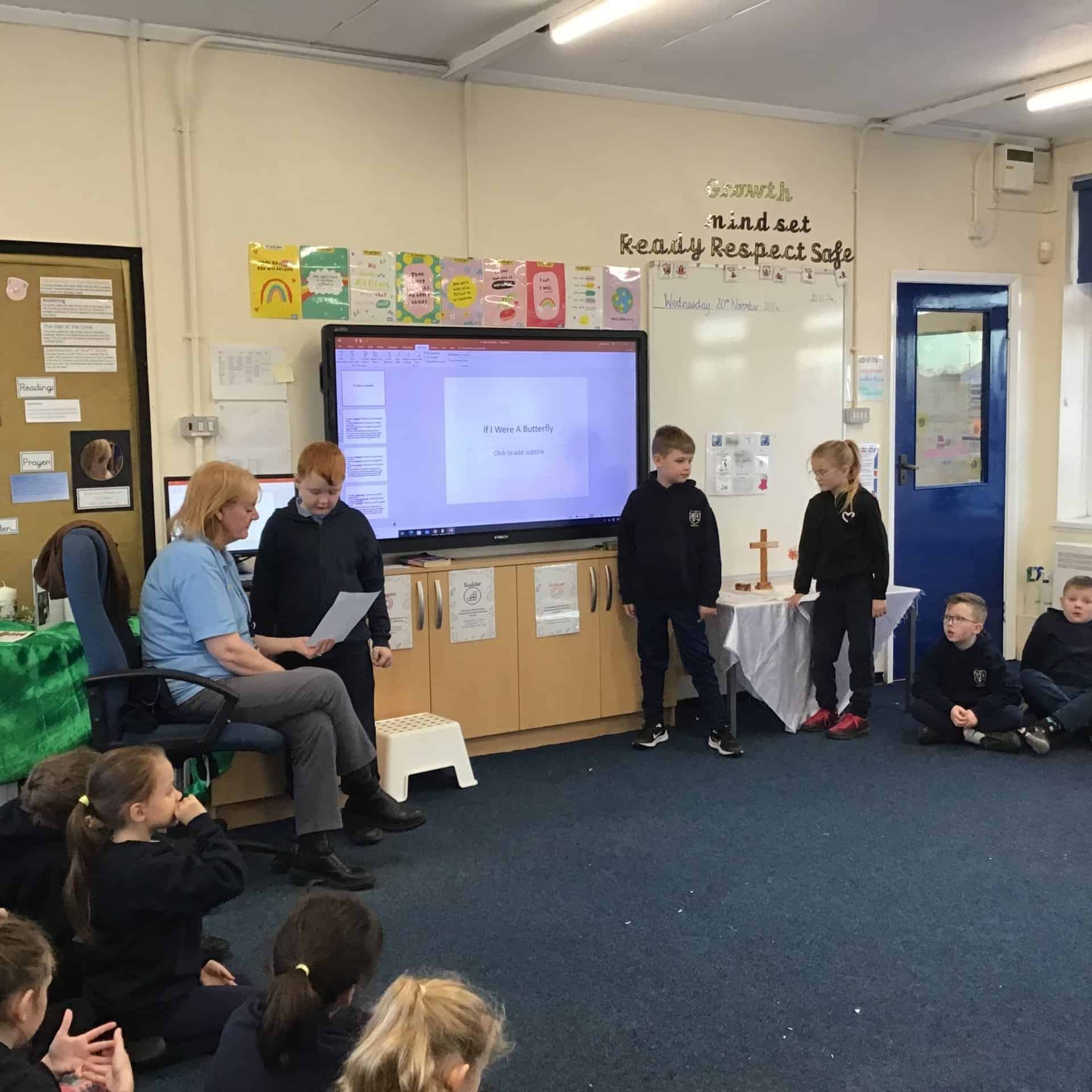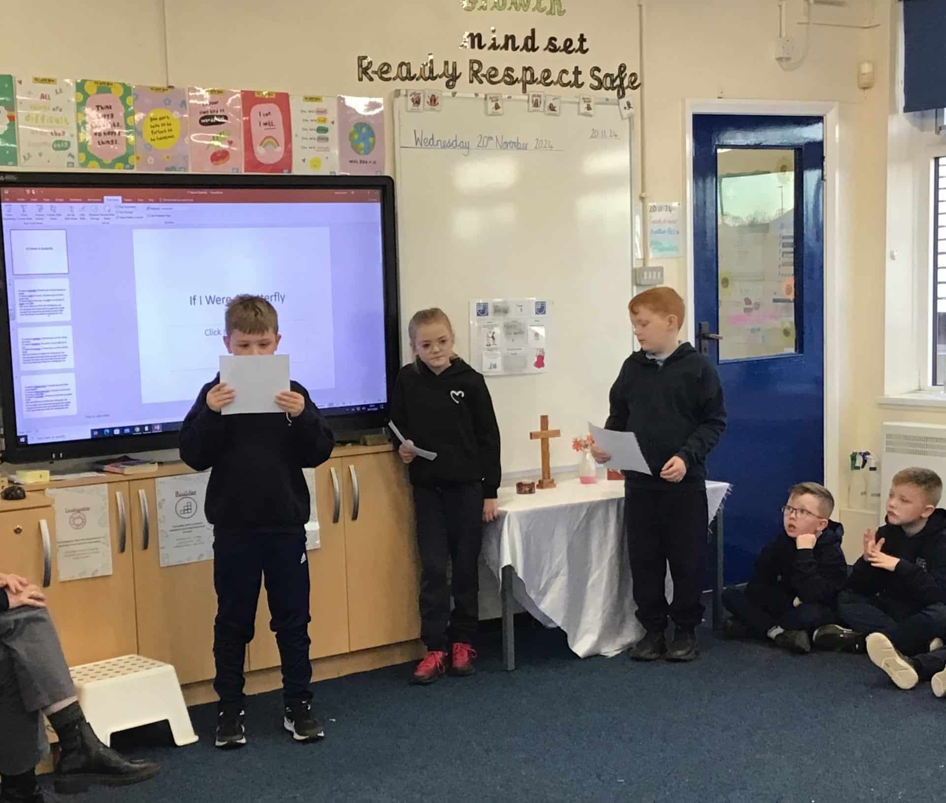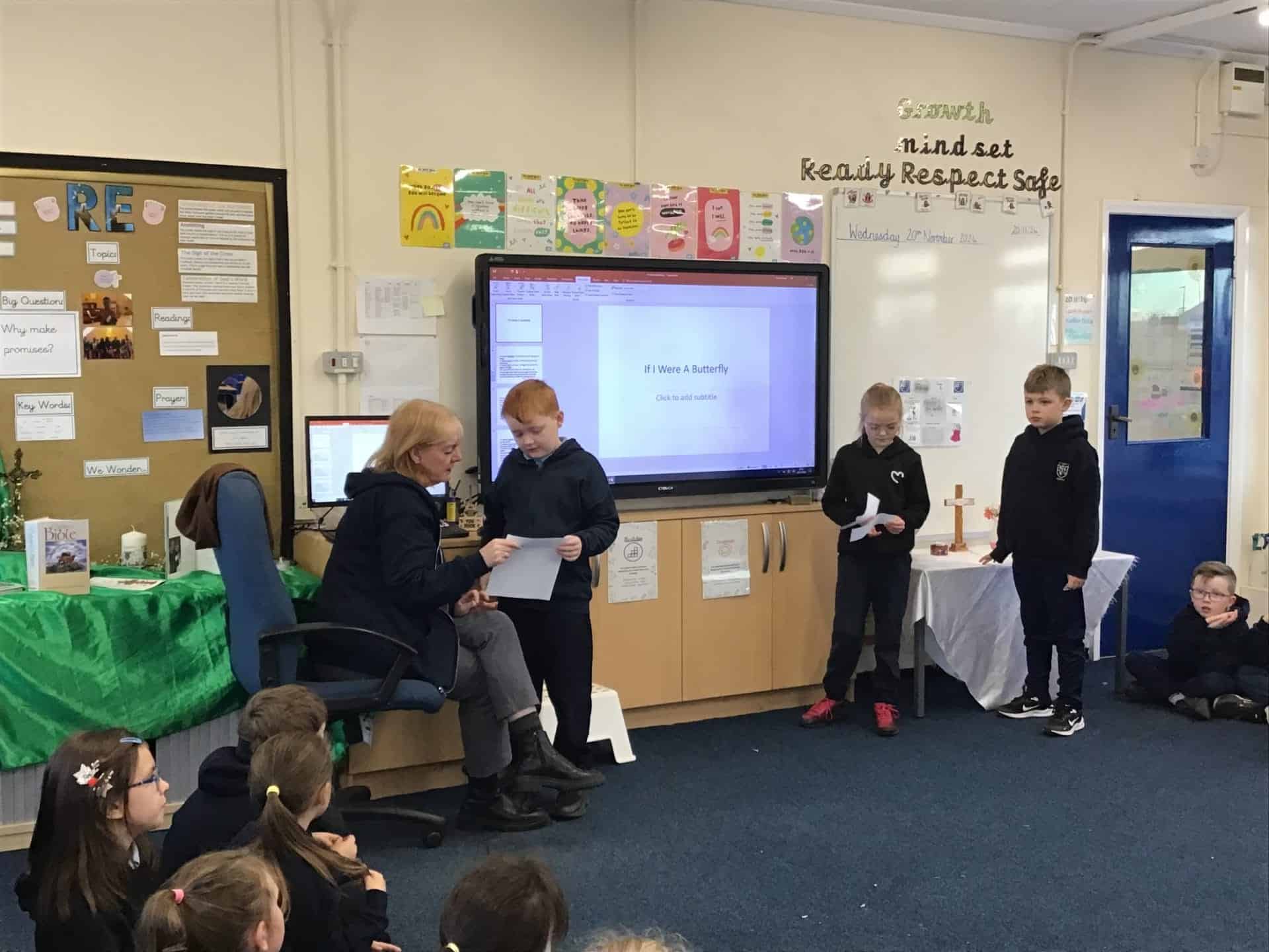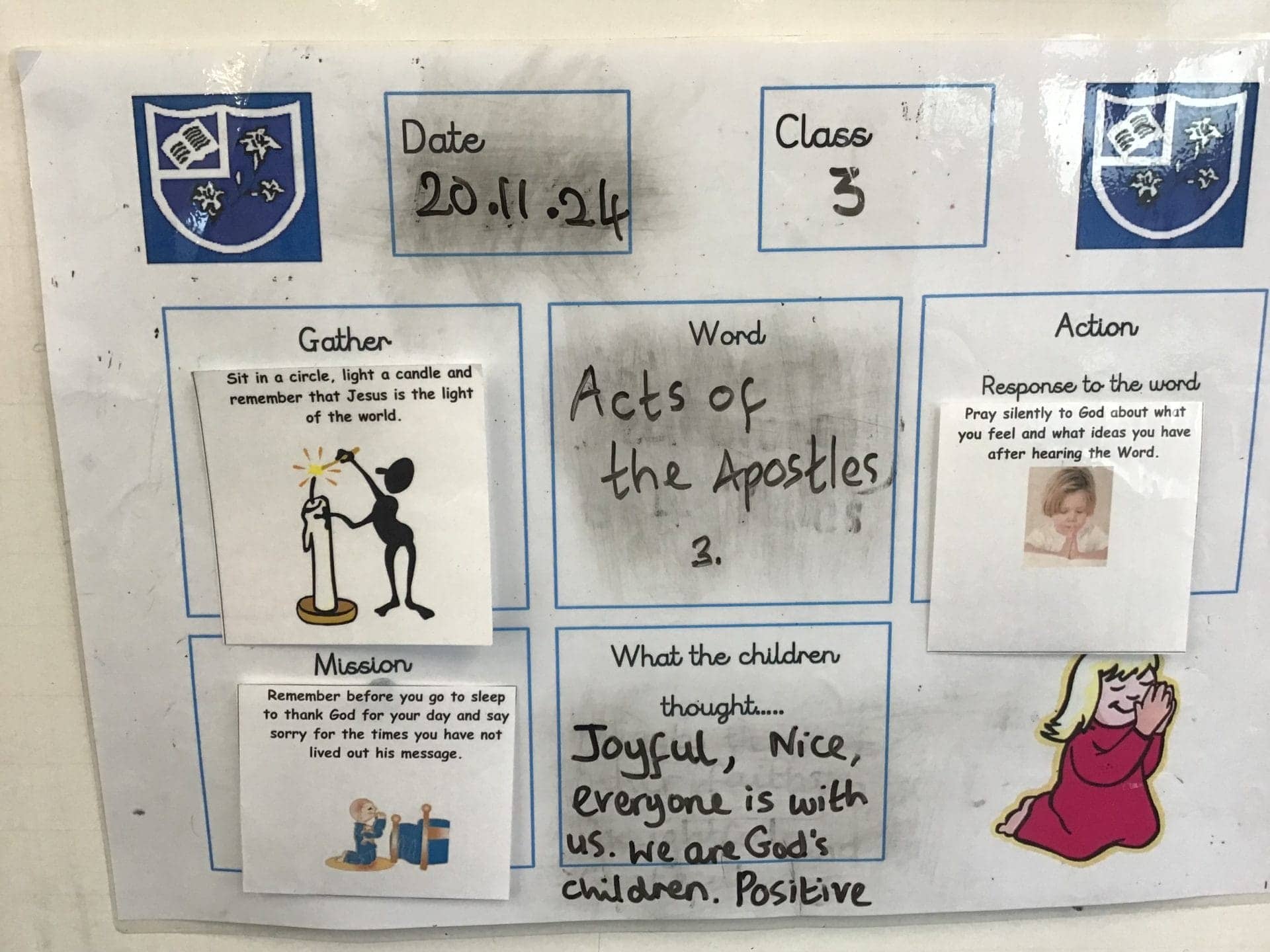 Today in class we were guided through a lovely liturgy by Joel, Myles and Kaci. The liturgy was a celebration of our topic of ‘Baptism – Belonging and Promises’. The reading was from the Acts of the Apostles and explained to us the importance of sharing and being a community. We sang ‘Jesus’ love is very wonderful and If I were a butterfly’. The children enjoyed sharing some of the promises and commitments they have made.