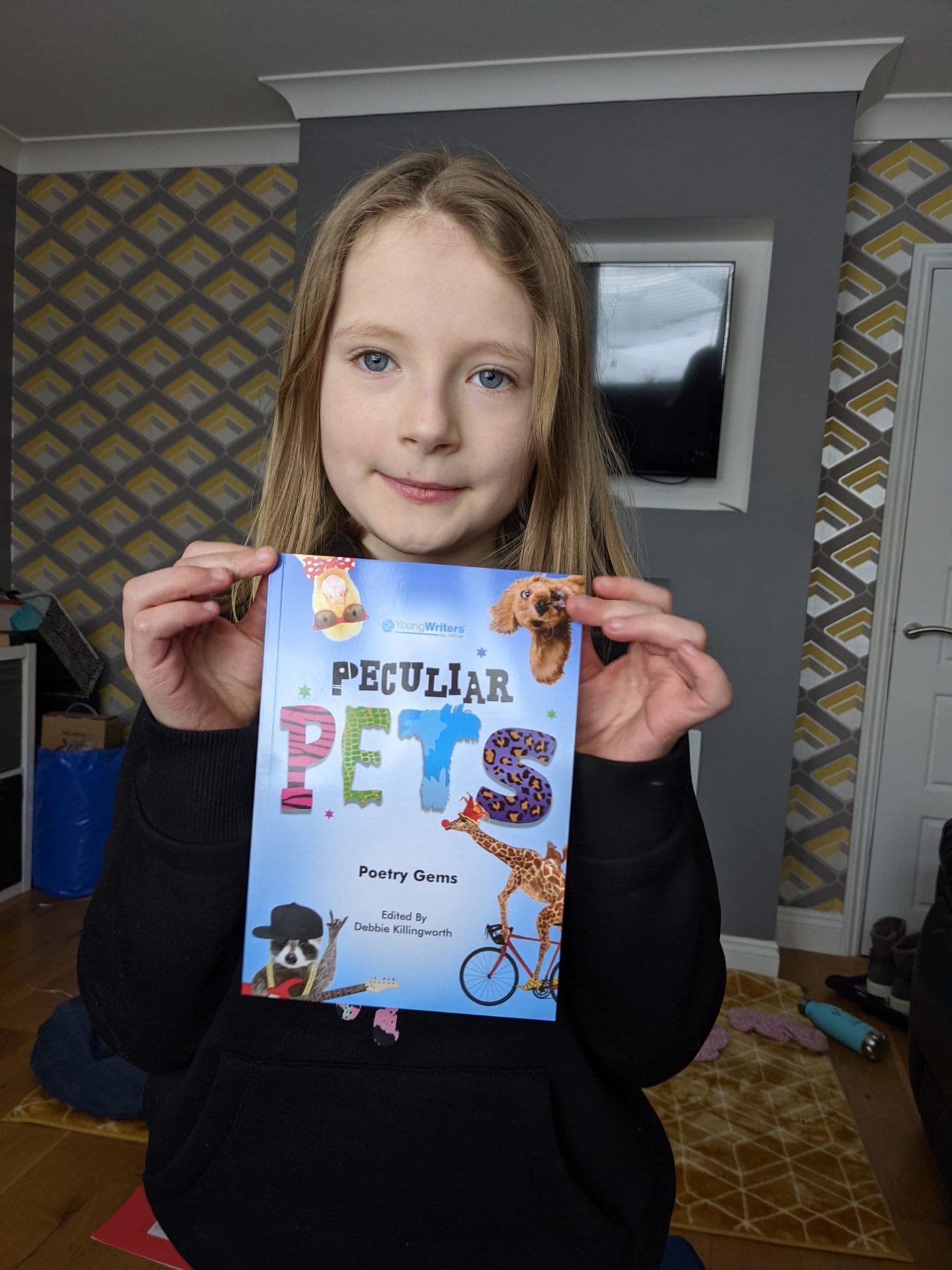 Earlier in the year we wrote poems for a competition. The poems were published in a book called ‘Peculiar Pets’. The children received their books and have been able to find their published poems.