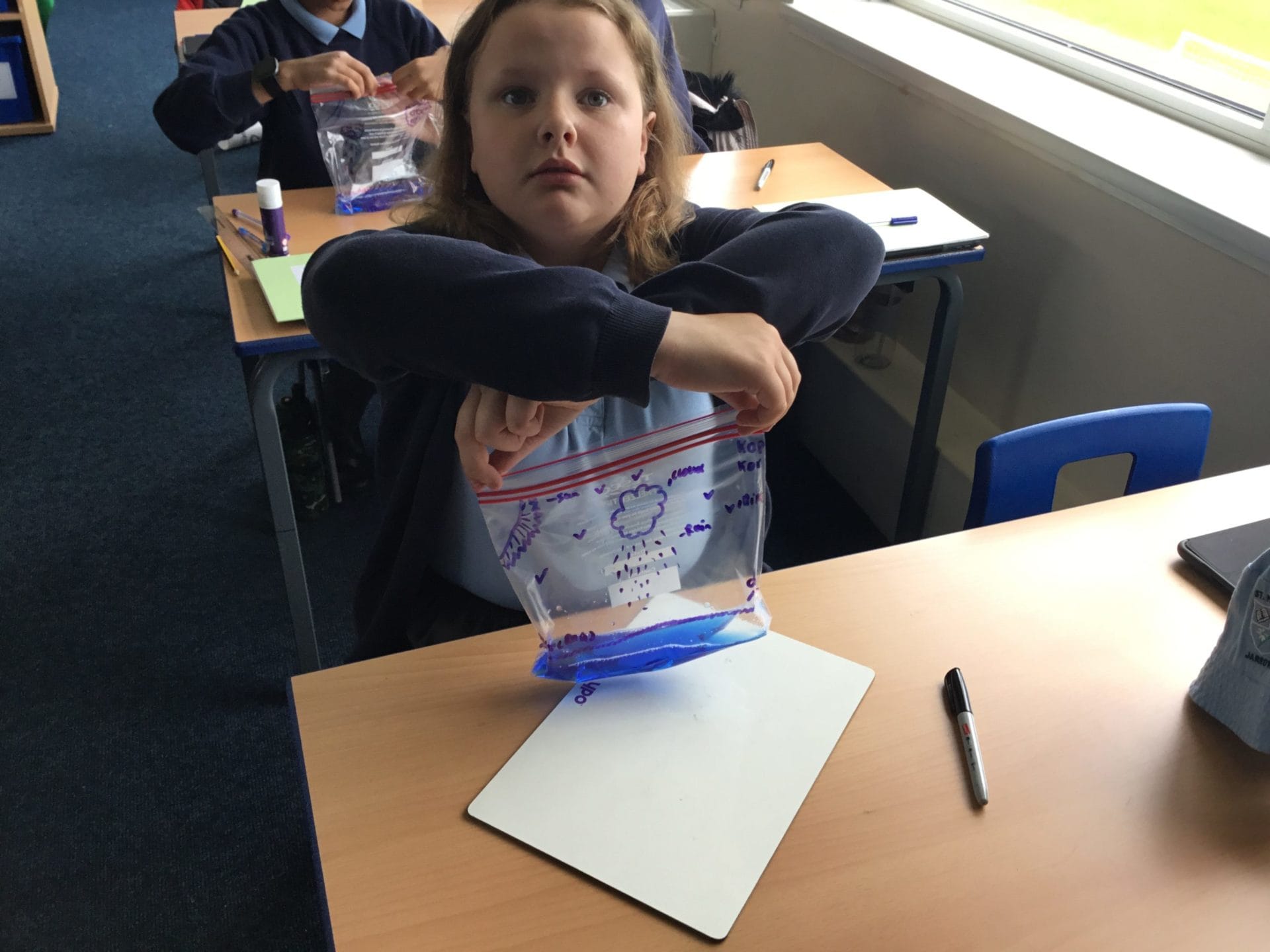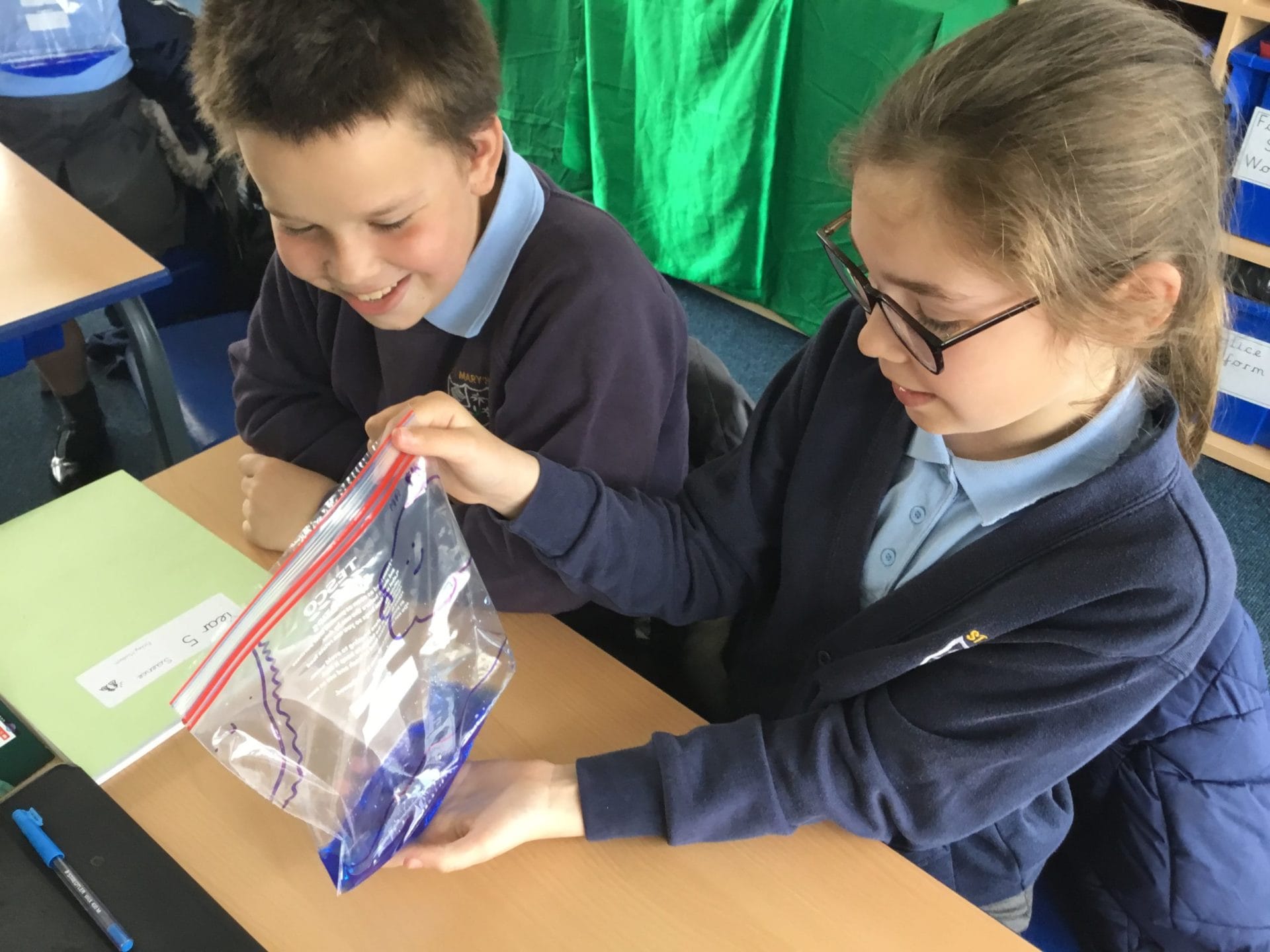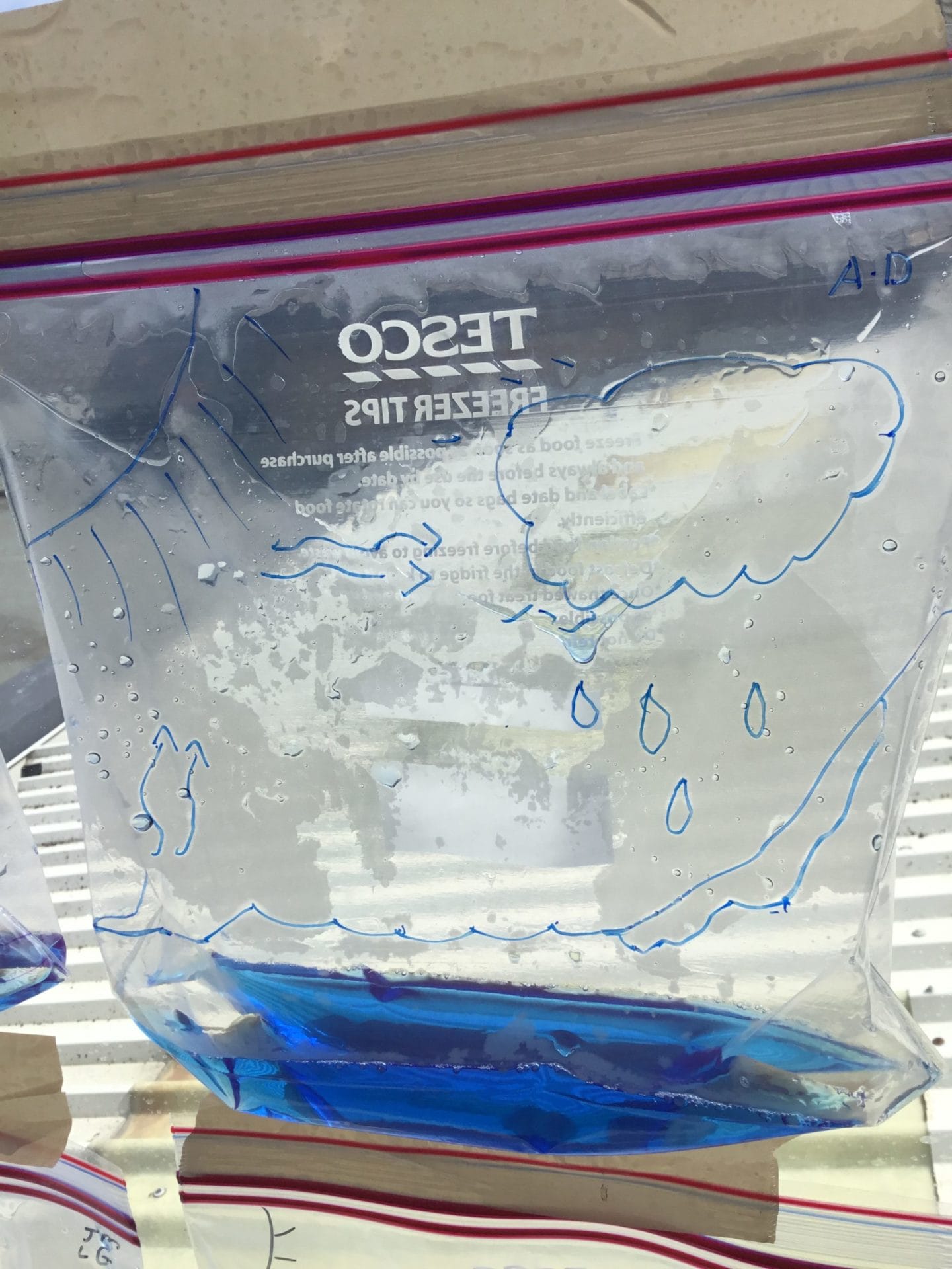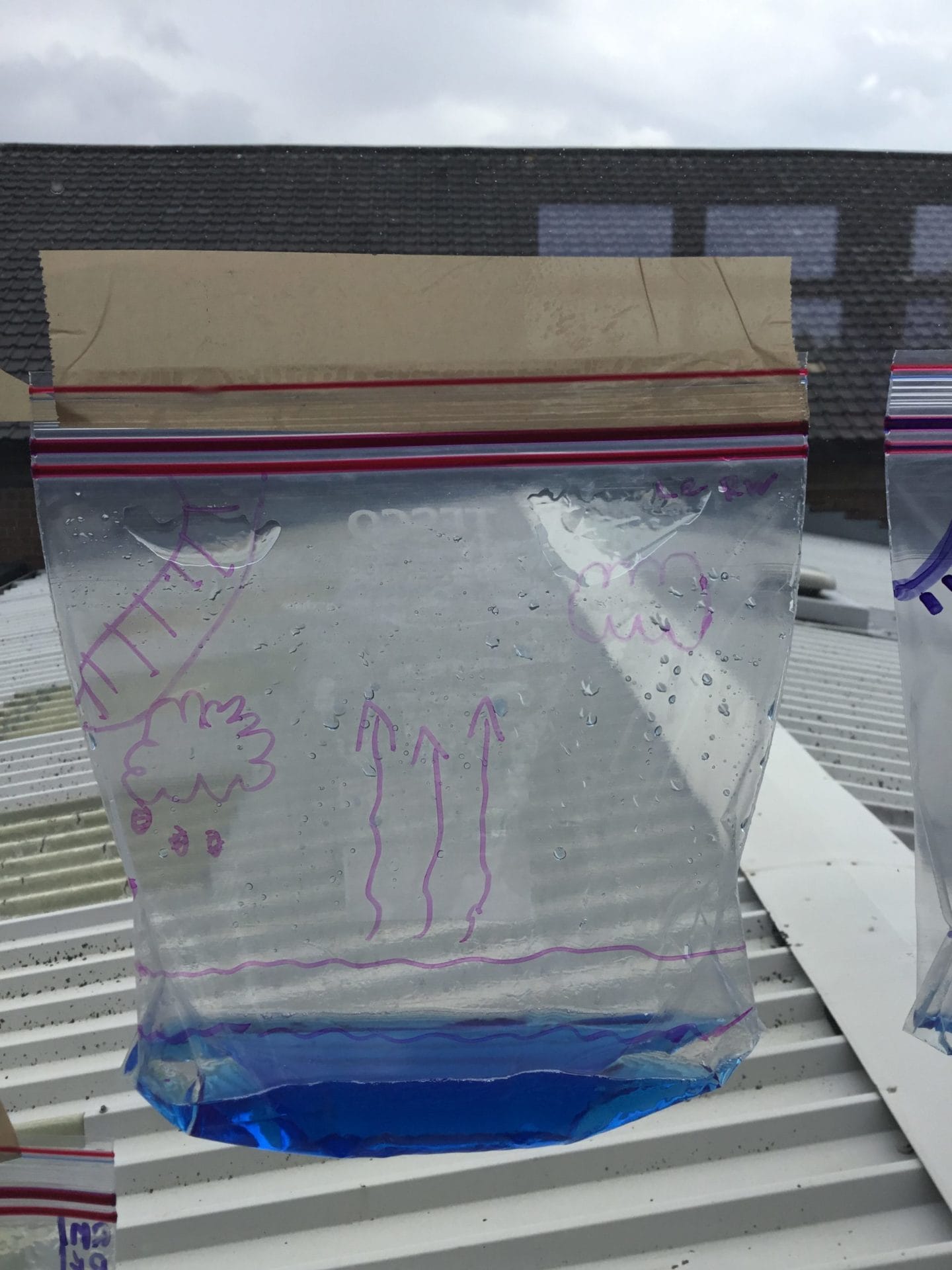 As part of Water Wise Week, the children created the water cycle in a bag to see the processes involved. Firstly, the children used permenant markers to draw a sky in the upper half of your plastic bag. Include clouds and the sun, as they are important elements to the water cycle. Next, the added blue food colouring to water and carefully poured the water into the plastic bag and zip it closed. Once the water was added to the bag and sealed it up, it’s was time to hang it up on a window! It was important to pick a window that gets a lot of sunshine for best results. Finally it was time to observe. Eventually, droplets of water started sticking to the side of the bag. Some of these were up high (in the clouds) while other droplets will be on their way back down (like rain). Why is this happening? It’s because the water in the bag is being heated up against the sunny window. That water turns into a gas through the process called evaporation. In nature, evaporated water vapour goes into the atmosphere, but in our bag, it has nowhere to go, so it ends up sticking to the sides of the bag, turning back into a liquid as condensation. That condensed water then slides back into the pool of water below as “rain”.