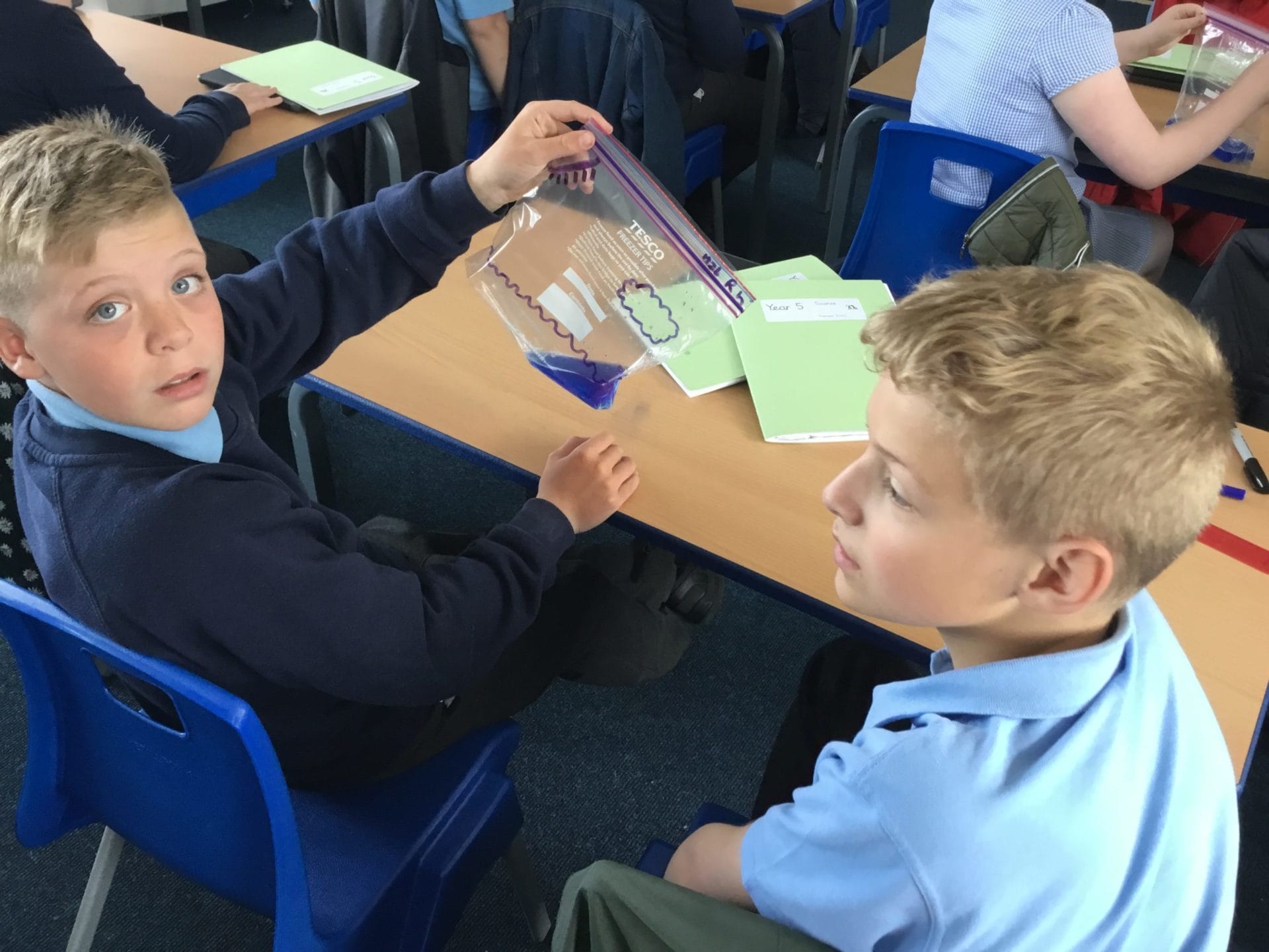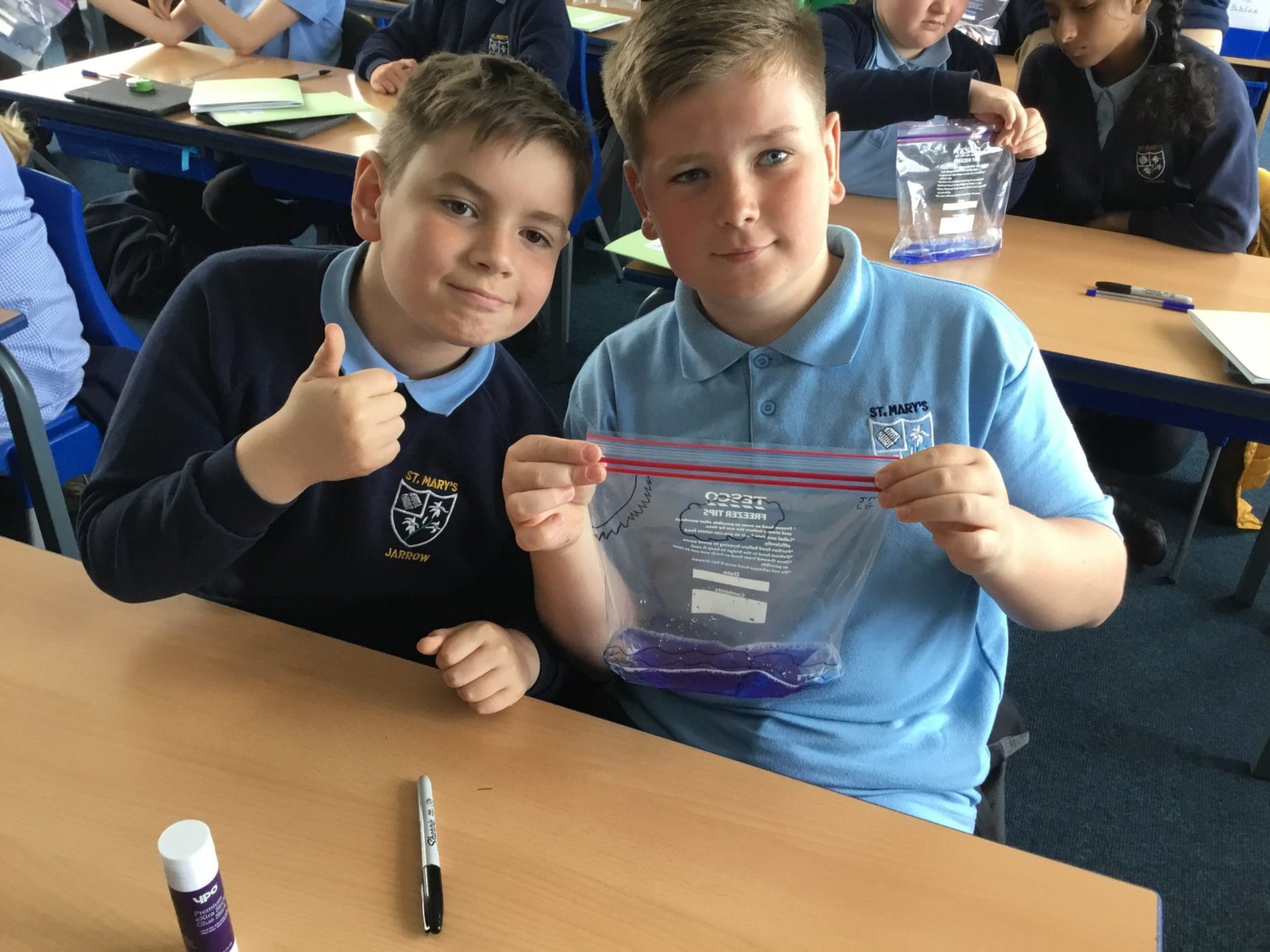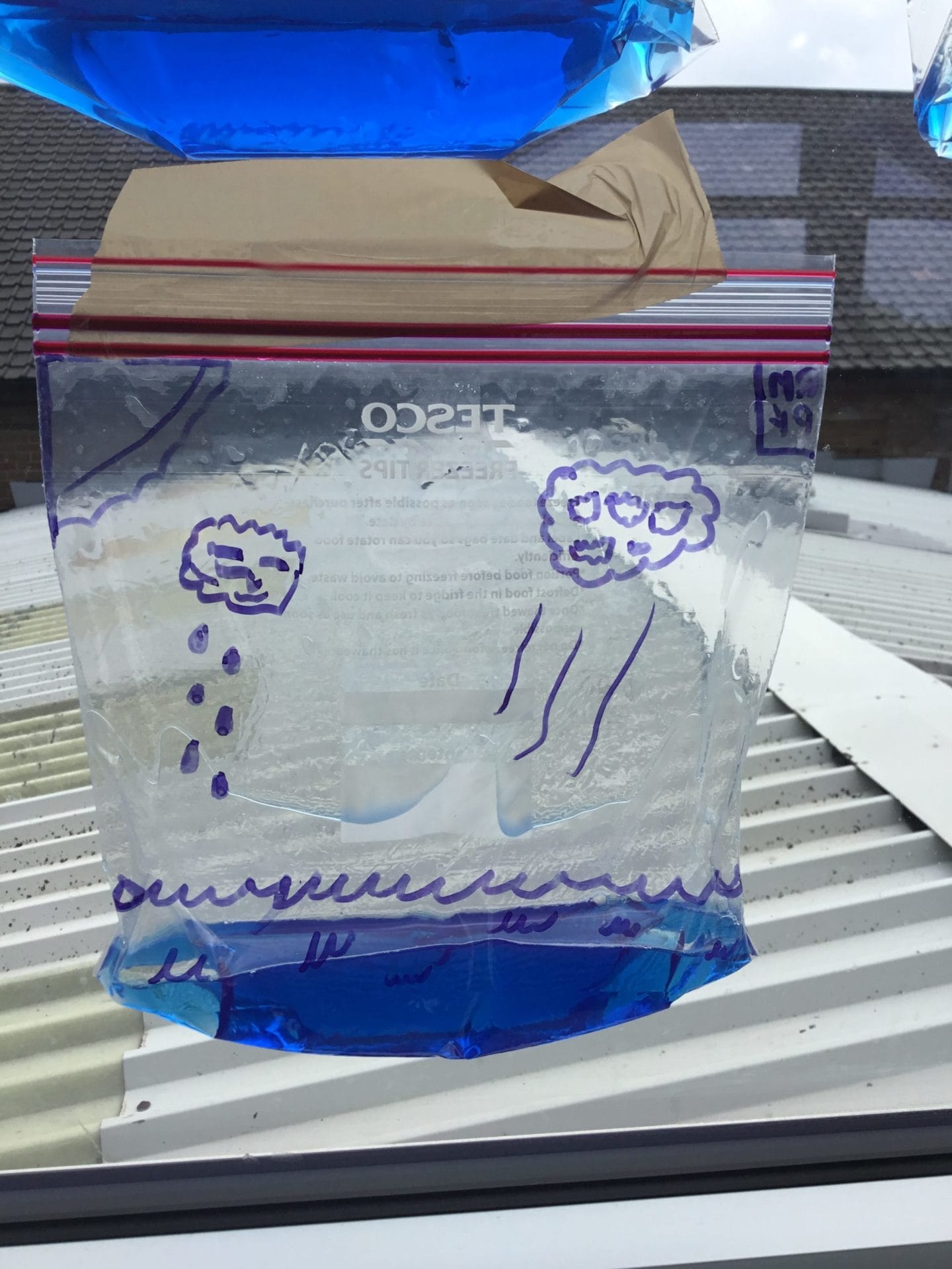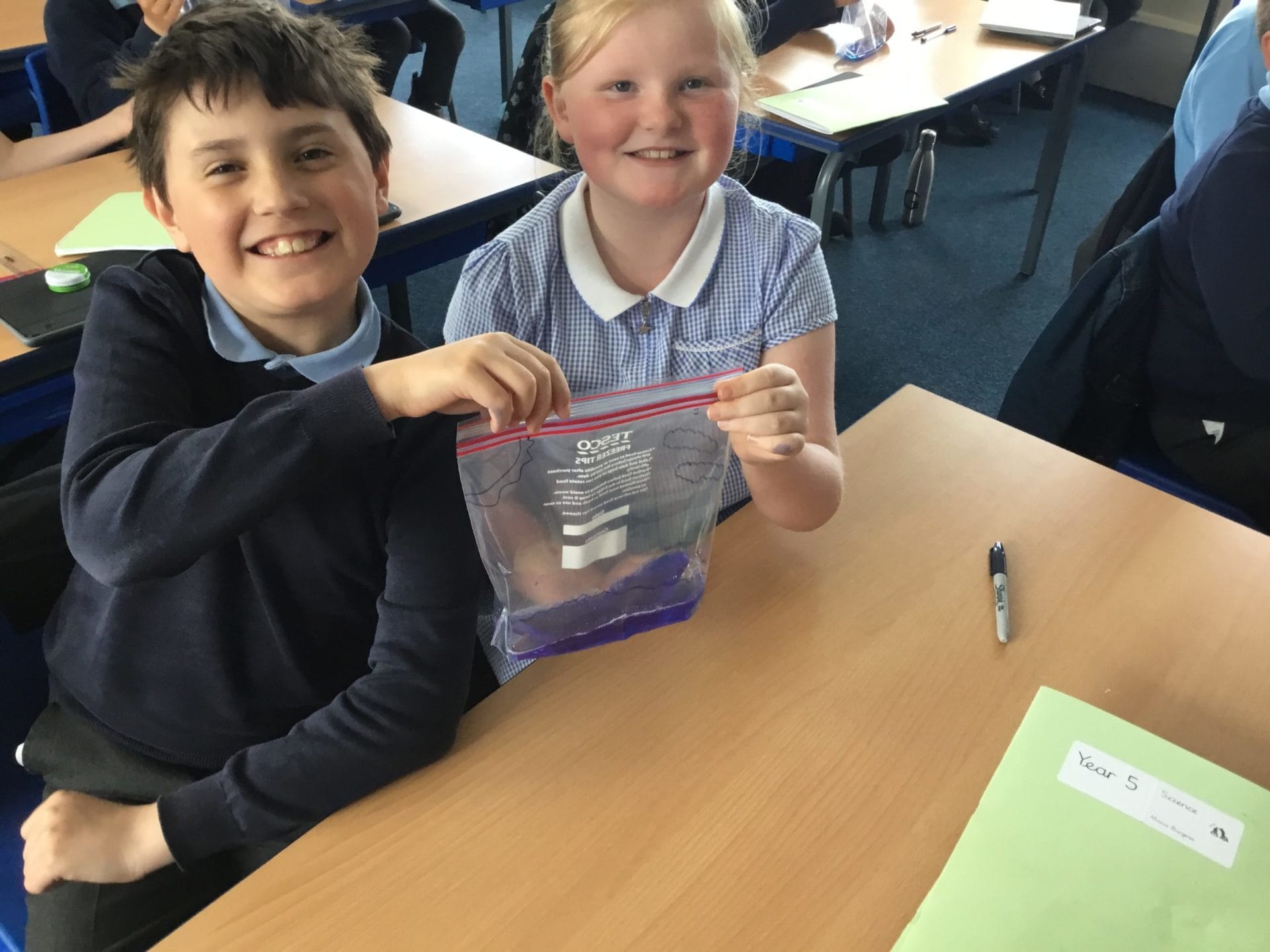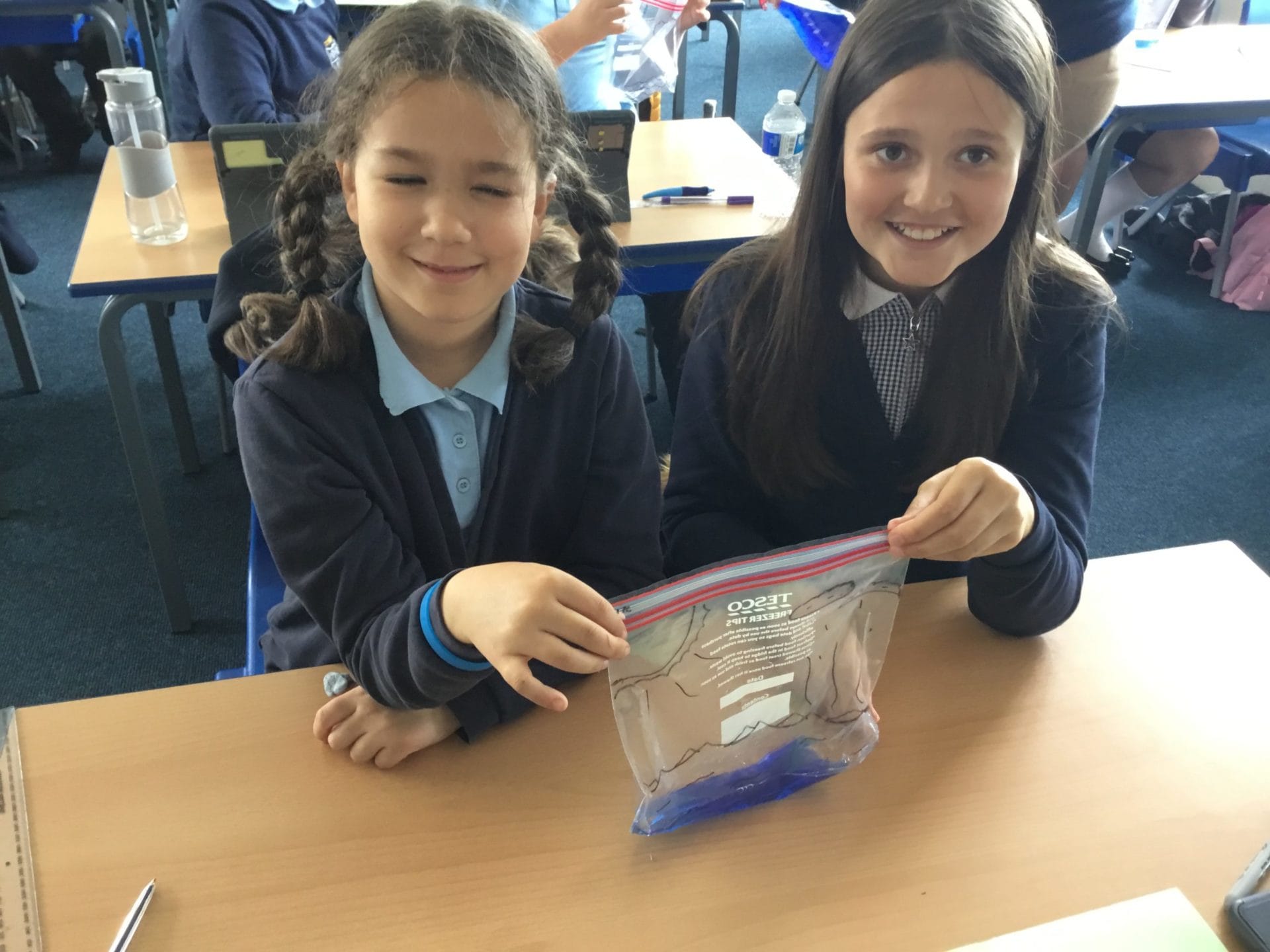 As part of Water Wise Week, the children created the water cycle in a bag to see the processes involved. Firstly, the children used permenant markers to draw a sky in the upper half of your plastic bag. Include clouds and the sun, as they are important elements to the water cycle. Next, the added blue food colouring to water and carefully poured the water into the plastic bag and zip it closed. Once the water was added to the bag and sealed it up, it’s was time to hang it up on a window! It was important to pick a window that gets a lot of sunshine for best results. Finally it was time to observe. Eventually, droplets of water started sticking to the side of the bag. Some of these were up high (in the clouds) while other droplets will be on their way back down (like rain). Why is this happening? It’s because the water in the bag is being heated up against the sunny window. That water turns into a gas through the process called evaporation. In nature, evaporated water vapour goes into the atmosphere, but in our bag, it has nowhere to go, so it ends up sticking to the sides of the bag, turning back into a liquid as condensation. That condensed water then slides back into the pool of water below as “rain”.
