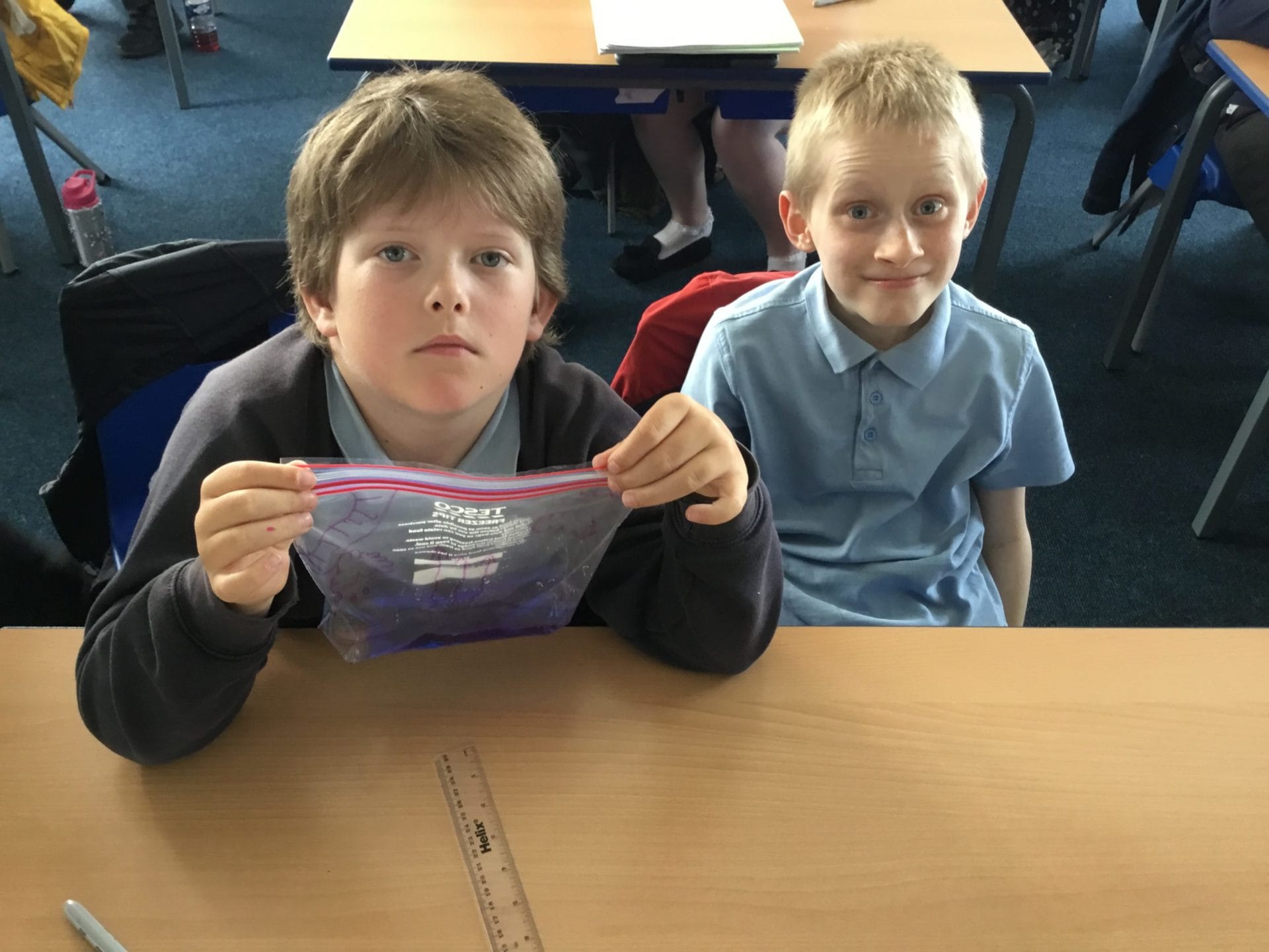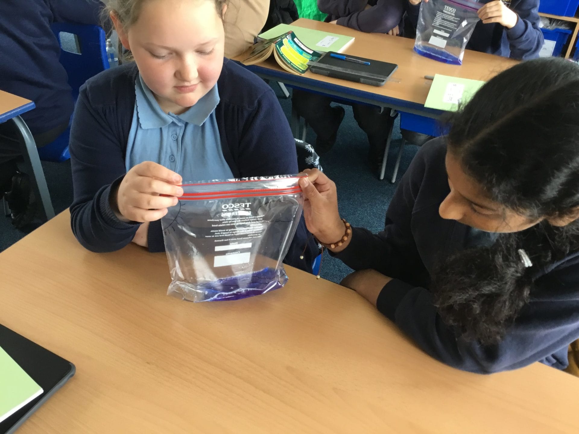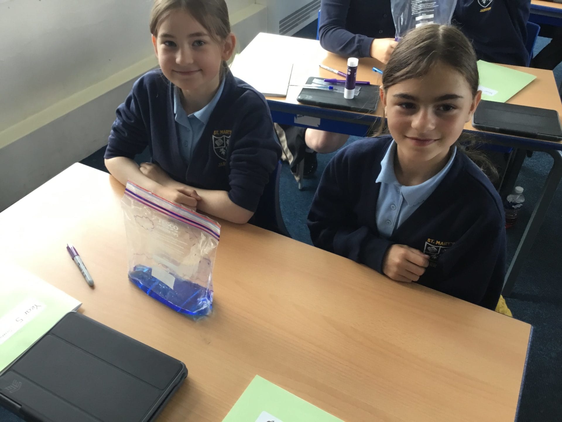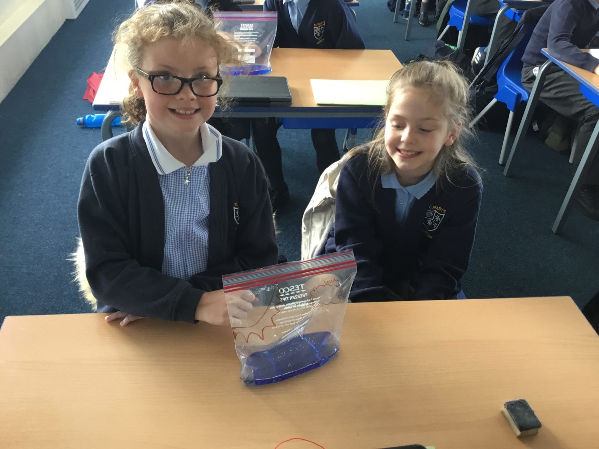 As part of Water Wise Week, the children created the water cycle in a bag to see the processes involved. Firstly, the children used permenant markers to draw a sky in the upper half of your plastic bag. Include clouds and the sun, as they are important elements to the water cycle. Next, the added blue food colouring to water and carefully poured the water into the plastic bag and zip it closed. Once the water was added to the bag and sealed it up, it’s was time to hang it up on a window! It was important to pick a window that gets a lot of sunshine for best results. Finally it was time to observe. Eventually, droplets of water started sticking to the side of the bag. Some of these were up high (in the clouds) while other droplets will be on their way back down (like rain). Why is this happening? It’s because the water in the bag is being heated up against the sunny window. That water turns into a gas through the process called evaporation. In nature, evaporated water vapour goes into the atmosphere, but in our bag, it has nowhere to go, so it ends up sticking to the sides of the bag, turning back into a liquid as condensation. That condensed water then slides back into the pool of water below as “rain”.