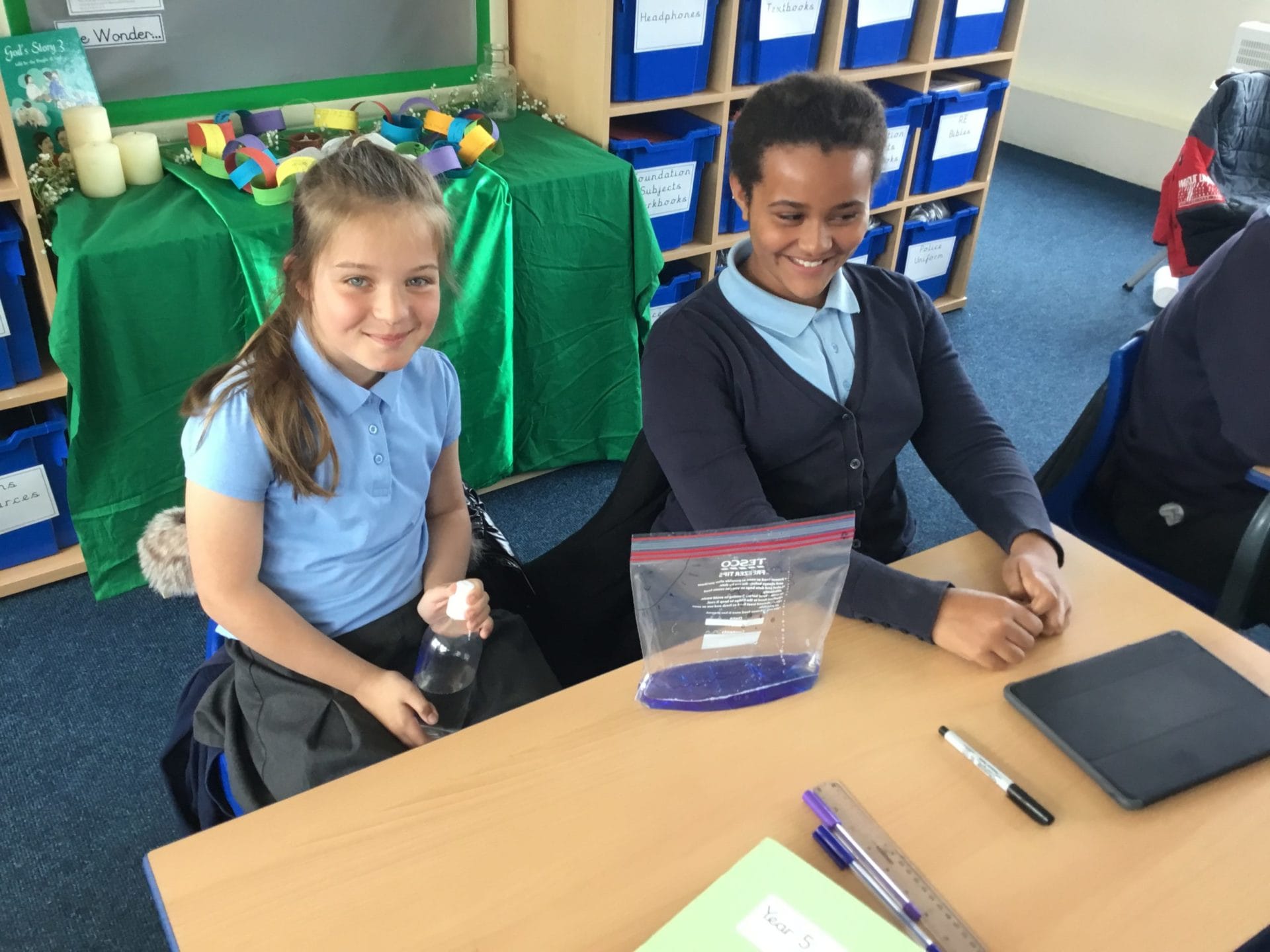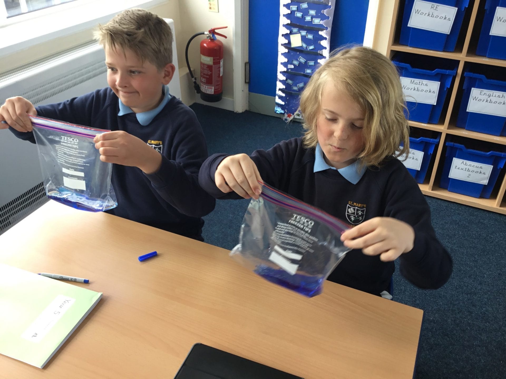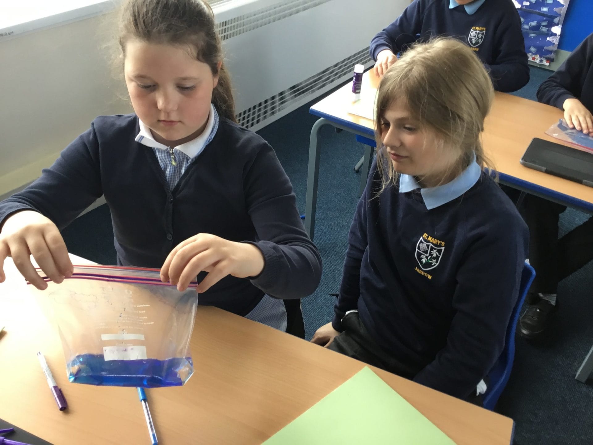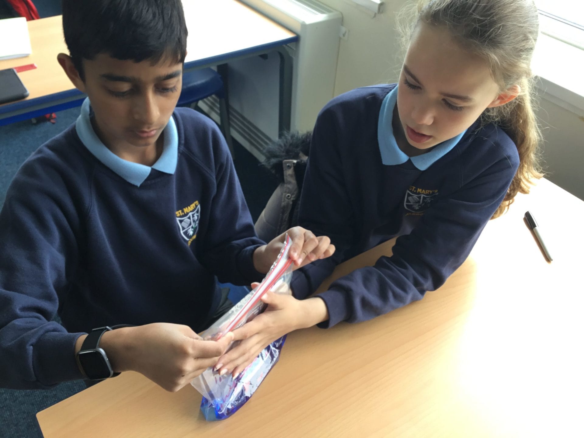 As part of Water Wise Week, the children created the water cycle in a bag to see the processes involved. Firstly, the children used permenant markers to draw a sky in the upper half of your plastic bag. Include clouds and the sun, as they are important elements to the water cycle. Next, the added blue food colouring to water and carefully poured the water into the plastic bag and zip it closed. Once the water was added to the bag and sealed it up, it’s was time to hang it up on a window! It was important to pick a window that gets a lot of sunshine for best results. Finally it was time to observe. Eventually, droplets of water started sticking to the side of the bag. Some of these were up high (in the clouds) while other droplets will be on their way back down (like rain). Why is this happening? It’s because the water in the bag is being heated up against the sunny window. That water turns into a gas through the process called evaporation. In nature, evaporated water vapour goes into the atmosphere, but in our bag, it has nowhere to go, so it ends up sticking to the sides of the bag, turning back into a liquid as condensation. That condensed water then slides back into the pool of water below as “rain”.